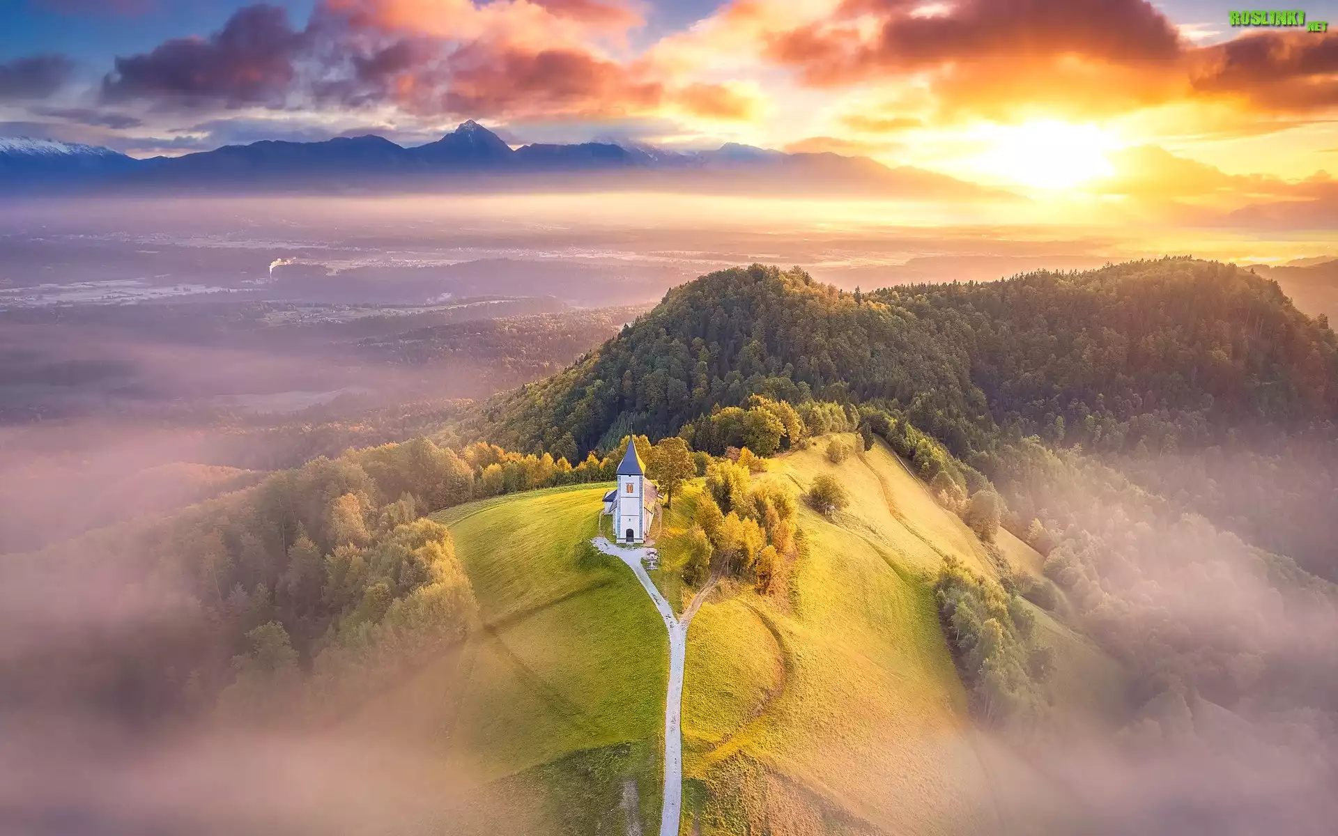 Kościół św Primusa i Felicjana, Wzgórze, Chmury, Mgła, Wschód słońca, Góry, Las, Drzewa, Jesień, Wieś Jamnik, Słowenia |