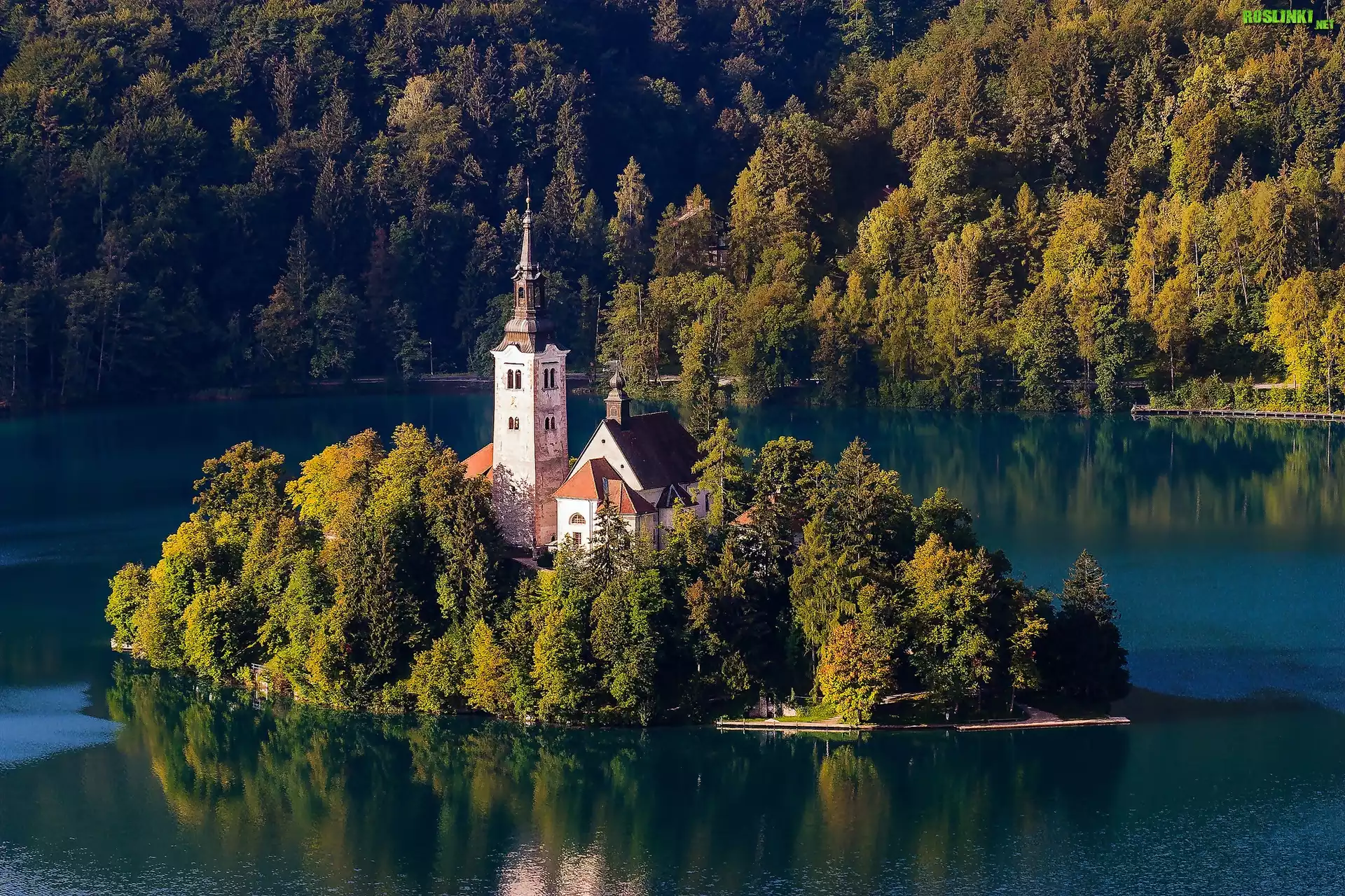 Słowenia, Jezioro Bled, Wyspa Blejski Otok, Kościół Zwiastowania Marii Panny, Jesień, Las, Drzewa |