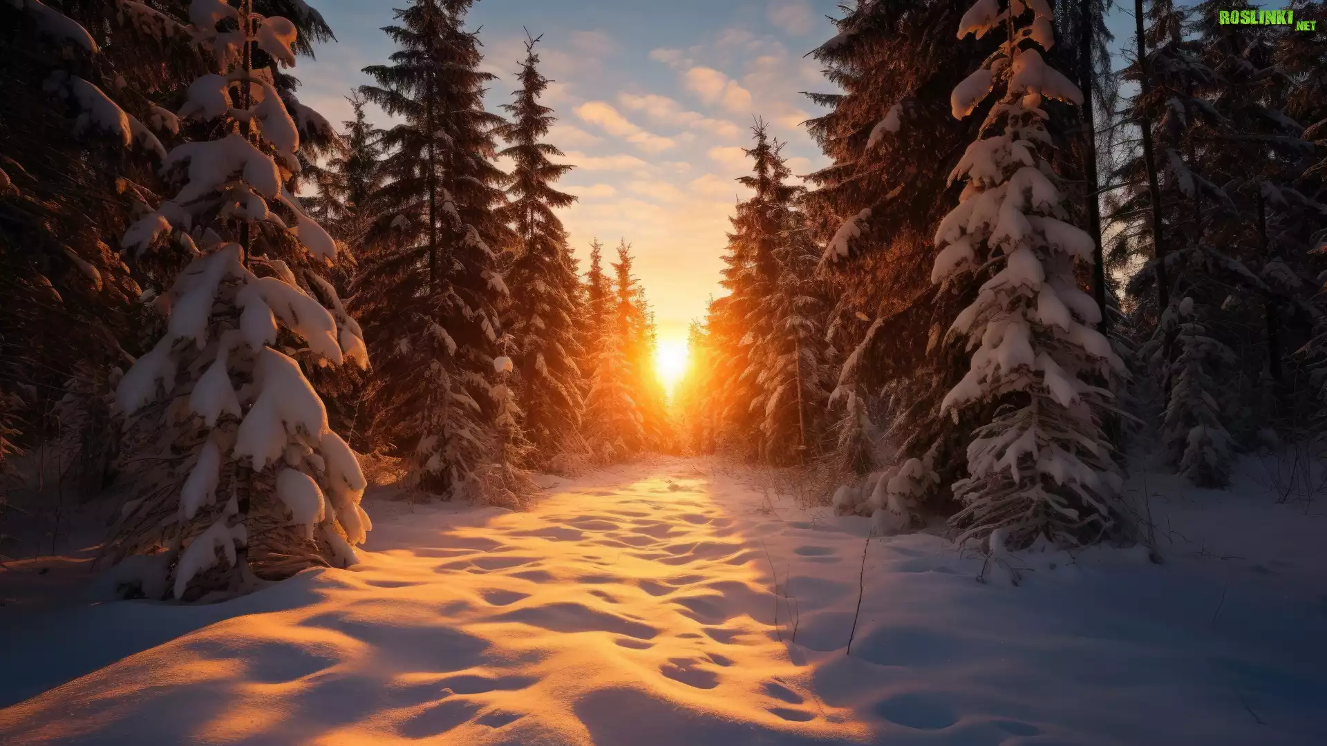 Rośliny: Zima, Las, Drzewa, Śnieg, Ślady, Zachód słońca