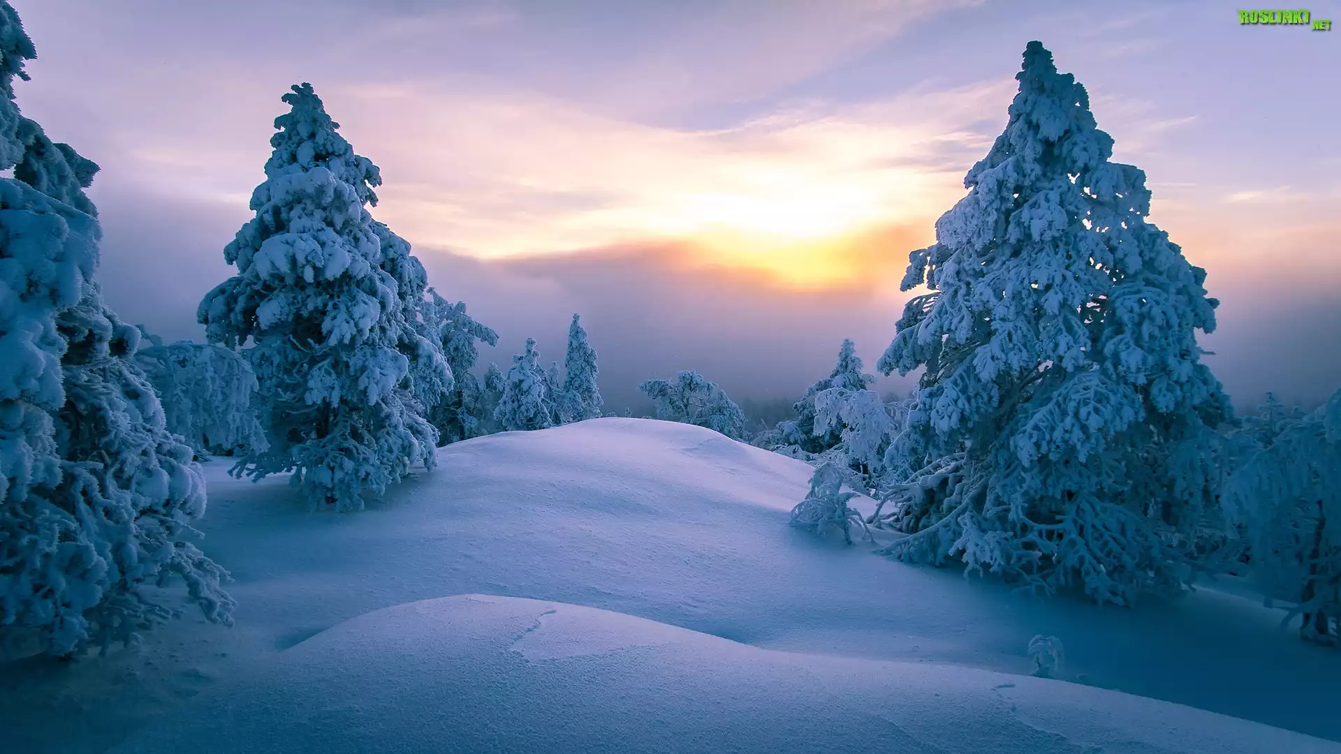 Rośliny: Zima, Las, Drzewa, Śnieg, Zaspy, Zachód słońca