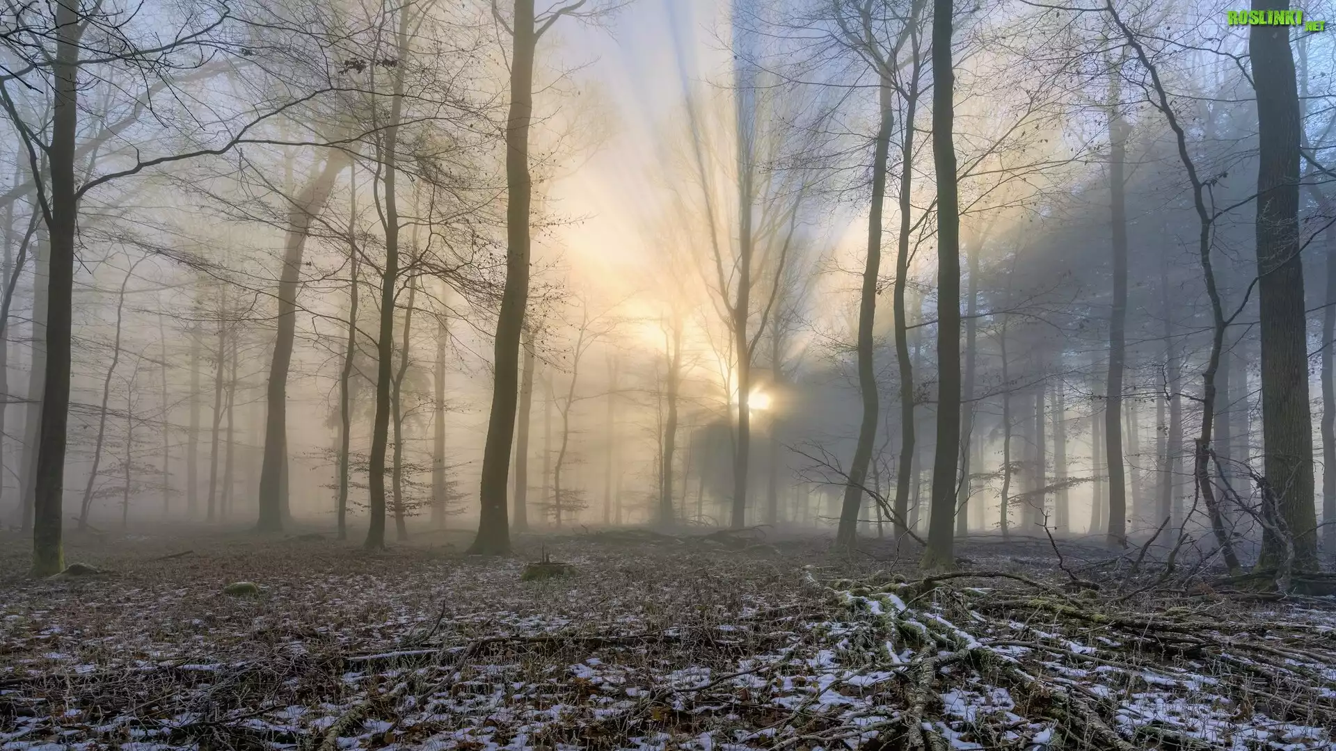 Rośliny: Las, Śnieg, Drzewa, Przebijające światło