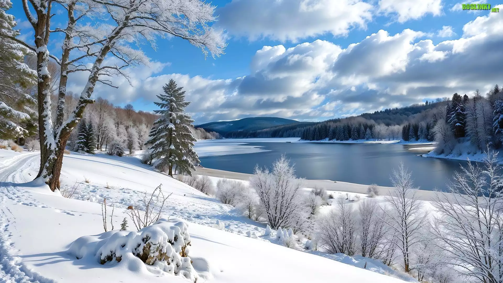 Rośliny: Zima, Rzeka, Drzewa, Śnieg, Droga, Grafika