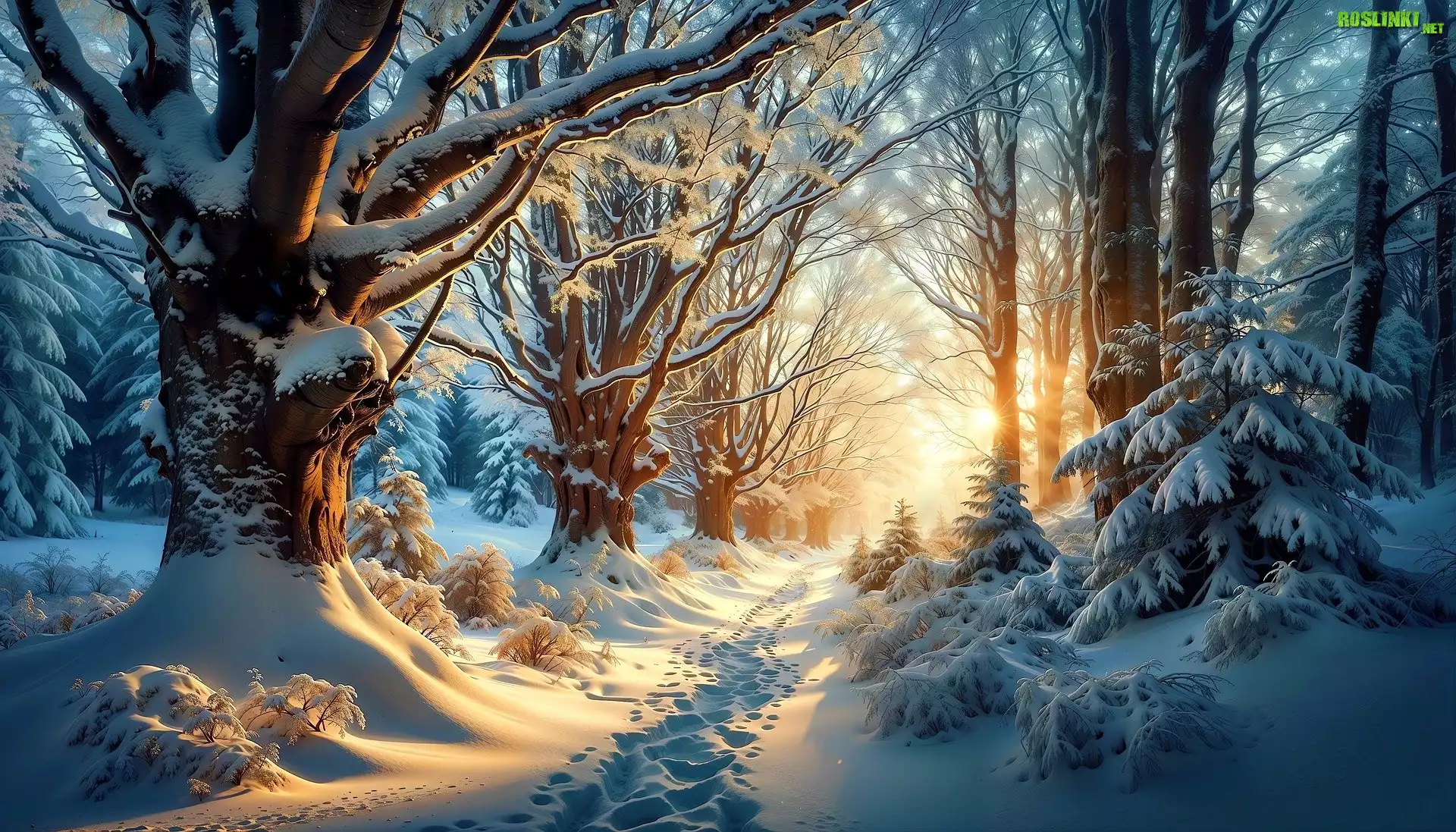 Rośliny: Zima, Drzewa, Las, Śnieg, Ślady, Grafika