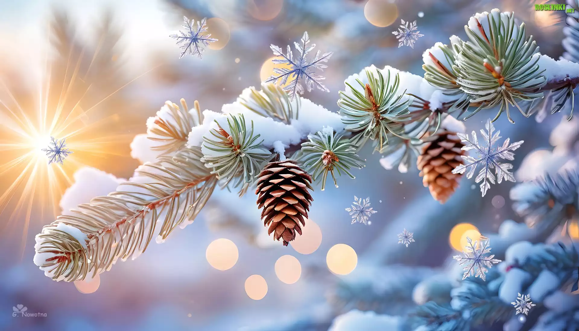 Rośliny: Gałązka, Świerk, Szyszki, Śnieg, Śnieżynki, Grafika