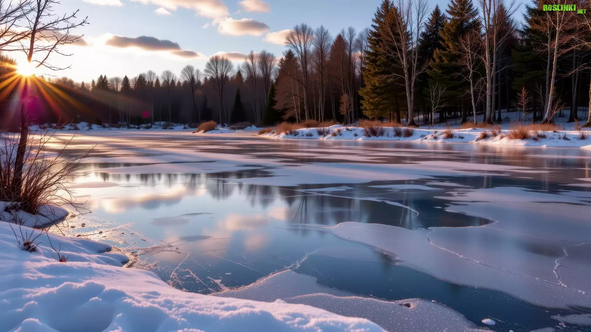 Rośliny: Zima, Zamarznięte, Jezioro, Śnieg, Promienie słońca, Drzewa