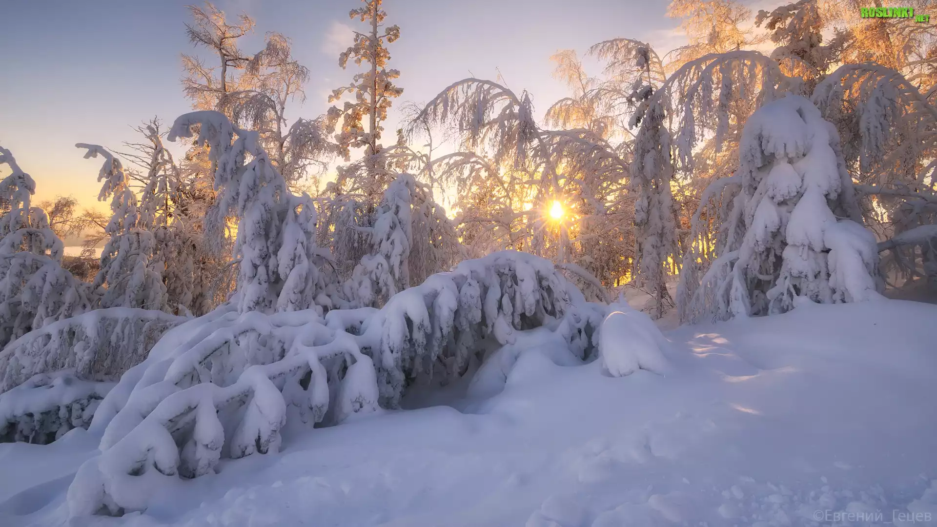 Rośliny: Drzewa, Śnieg, Zima, Wschód słońca