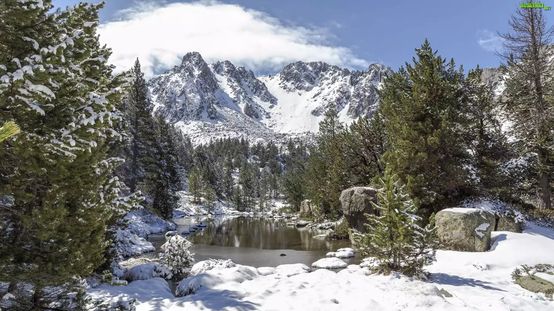 Rośliny: Góry, Śnieg, Zima, Drzewa, Staw