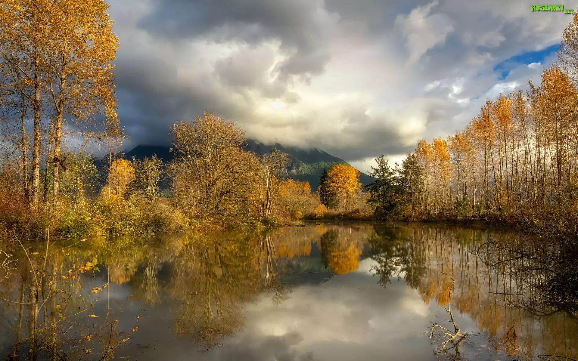 Jesień, Drzewa, Staw, Dolina, Snoqualmie Valley, Góra, Mount Si, Chmury, Stan Waszyngton, Stany Zjednoczone |