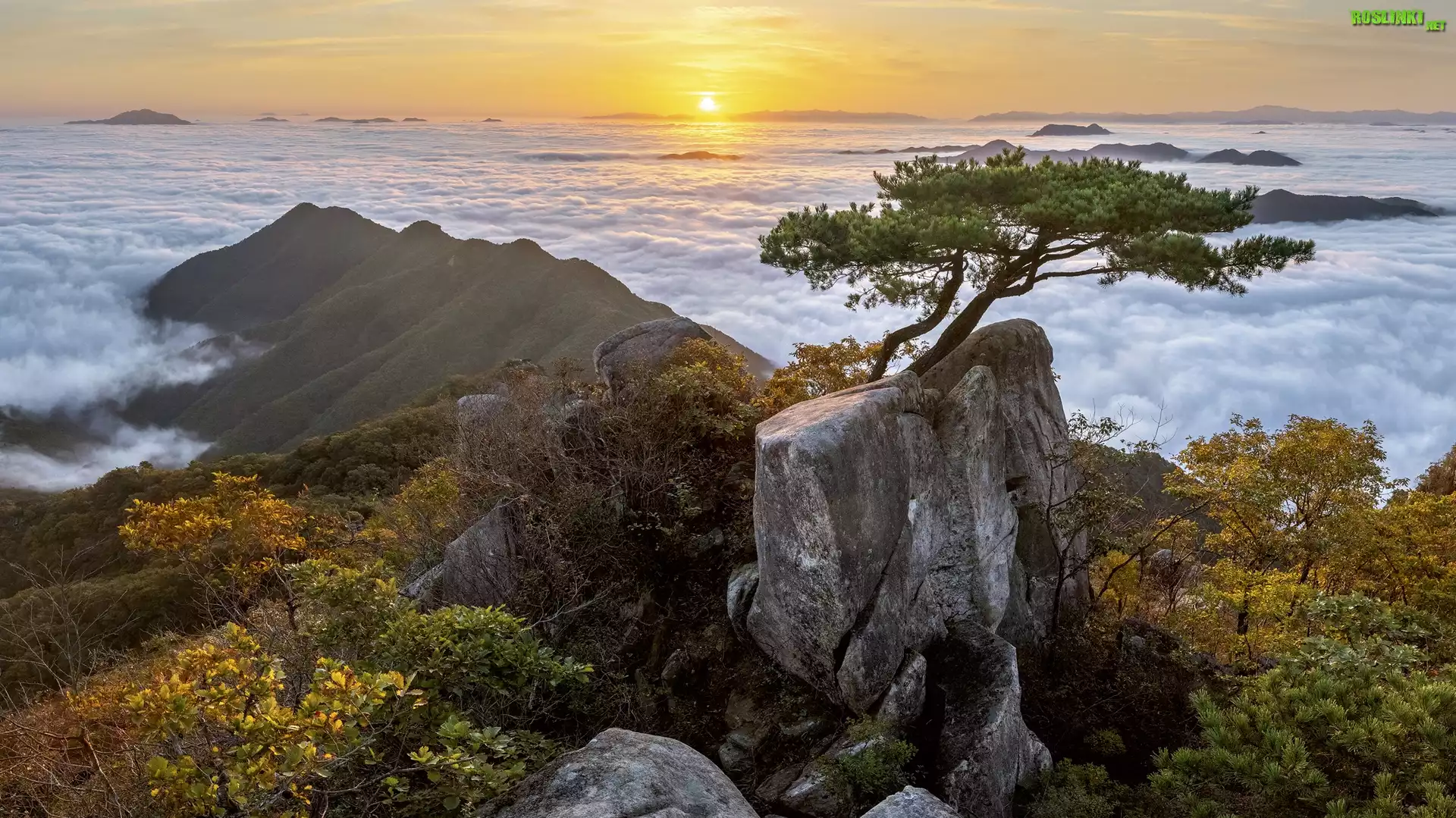 Rośliny: Wschód słońca, Góry, Skały, Mgła, Chmury, Rośliny, Drzewo, Sosna
