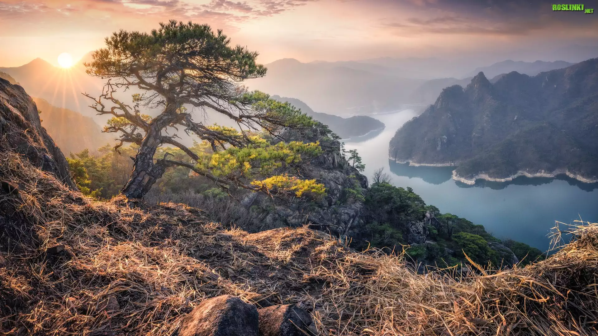 Rośliny: Góry, Rzeka, Drzewo, Sosna, Mgła, Trawa