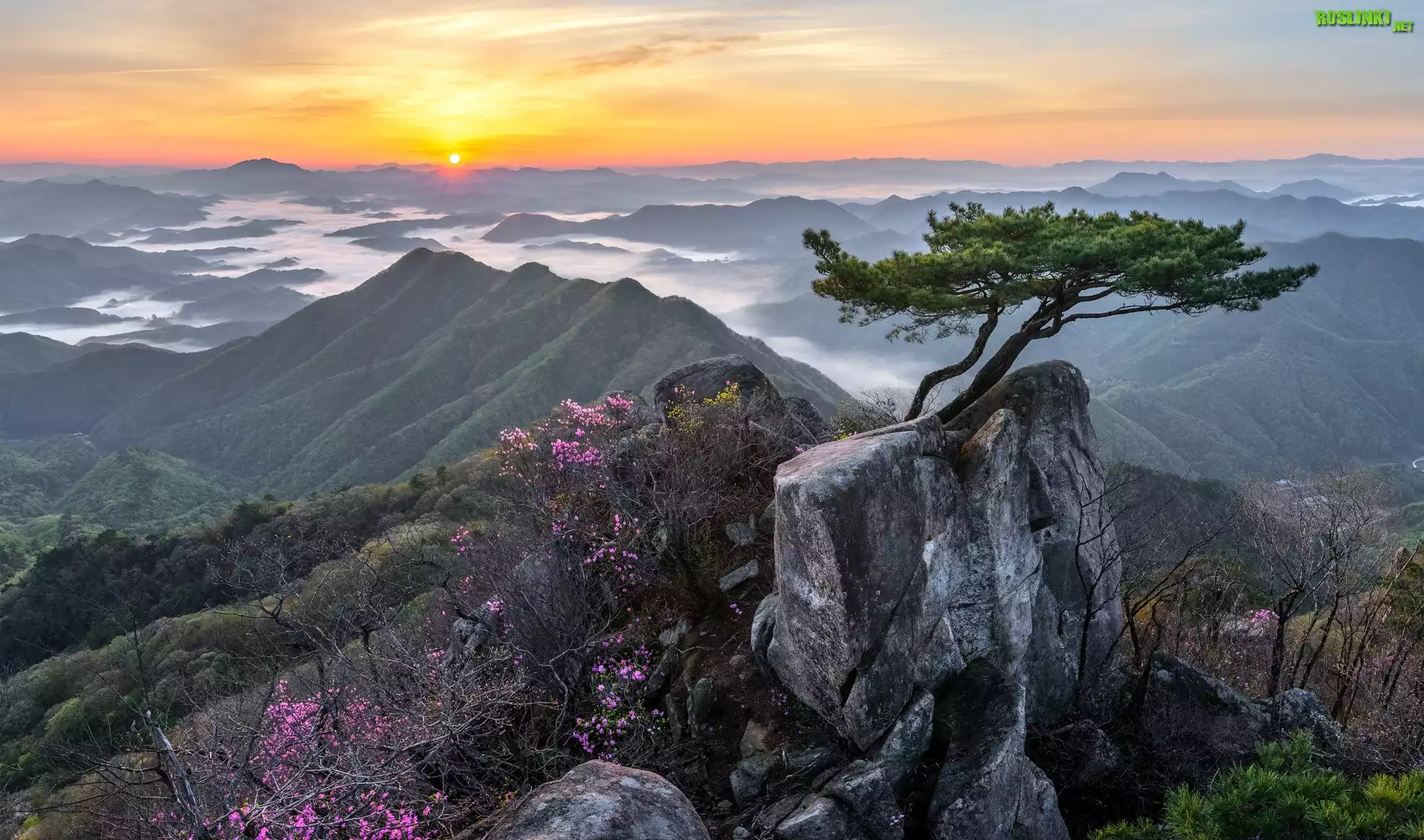 Wschód słońca, Góry, Skały, Sosna, Kwiaty, Park Prowincjonalny Daedunsan, Prowincja Jeolla Północna, Korea Południowa |