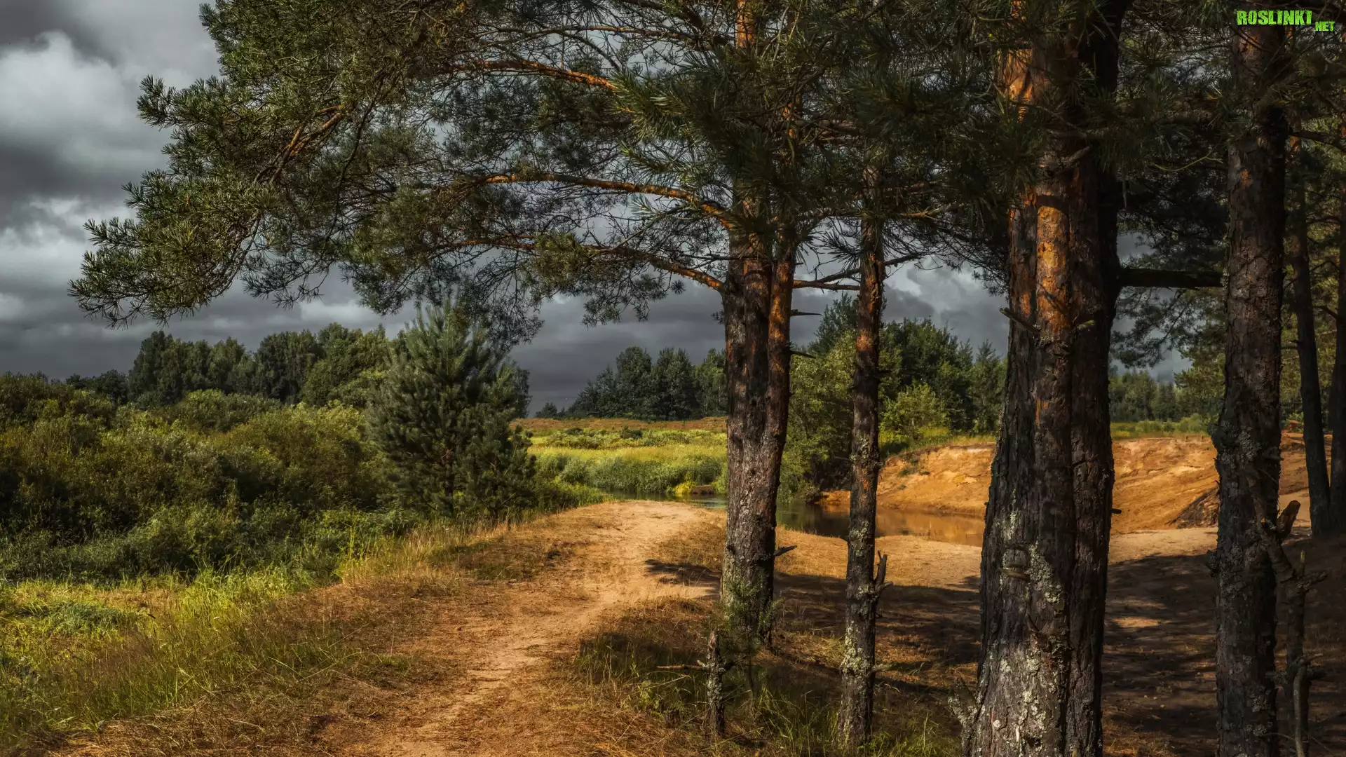 Rośliny: Drzewa, Sosny, Ścieżka, Krzewy, Chmury