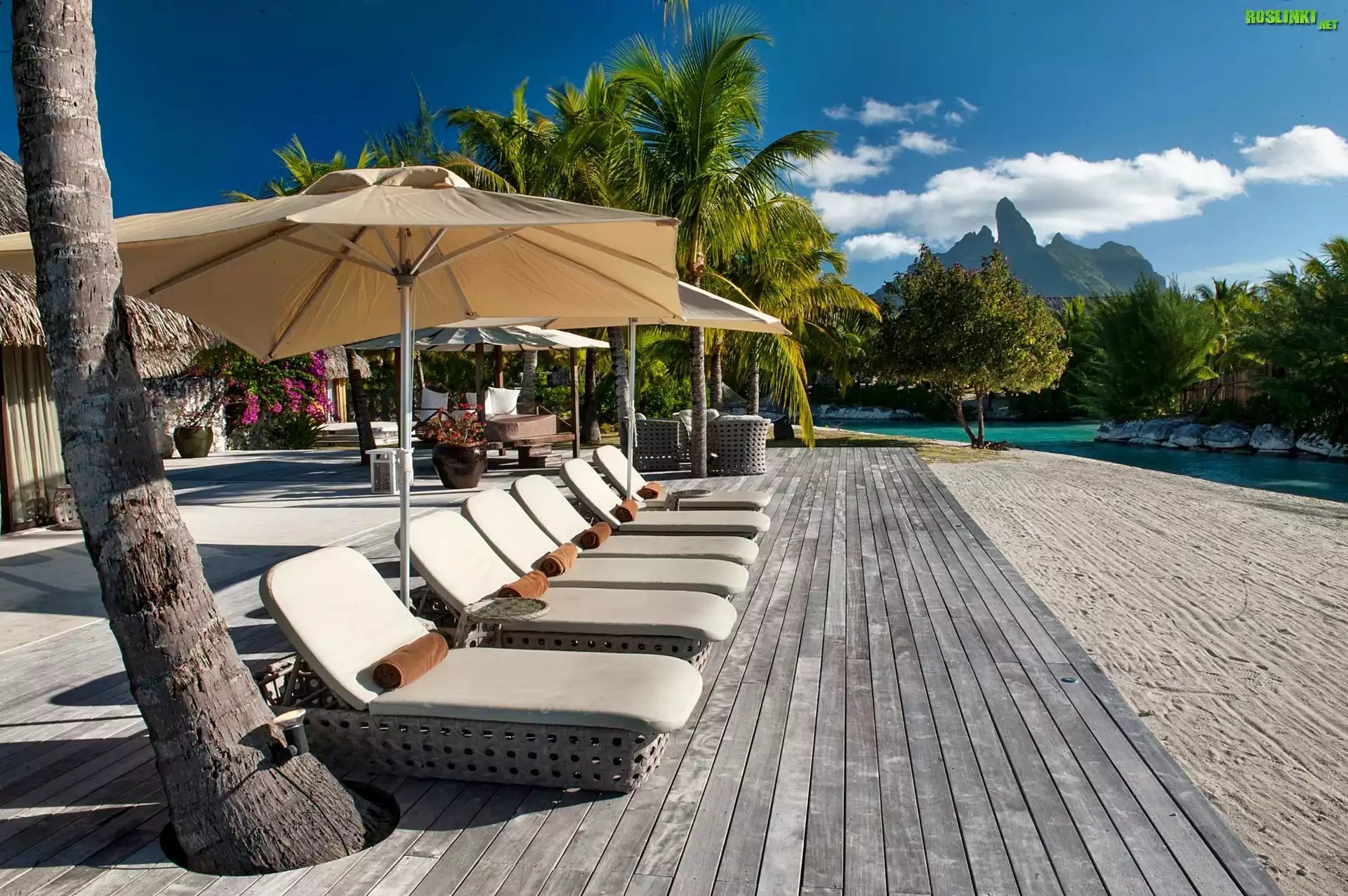 Rośliny: Polinezja Francuska, Bora Bora, Góra, Leżaki, Parasole, Palmy, Wakacje