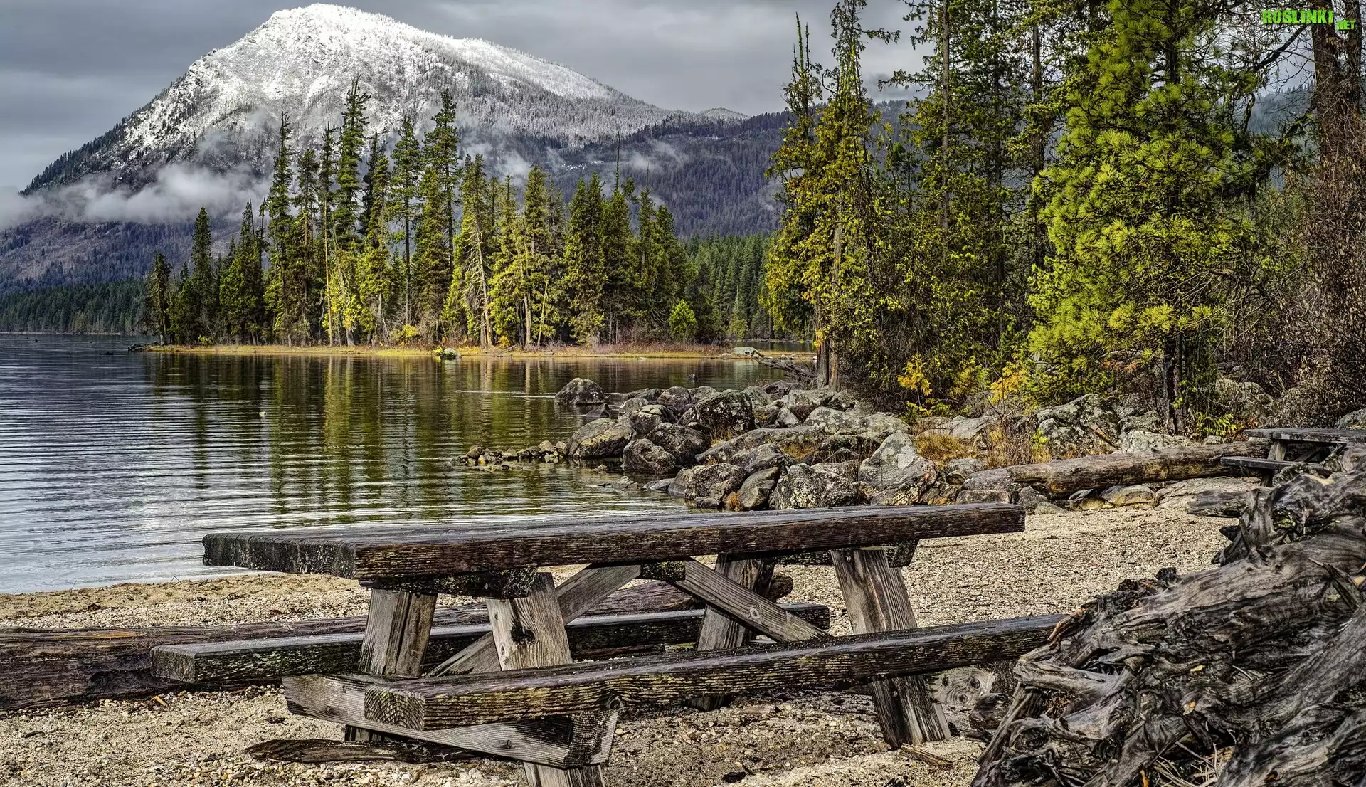 Stany Zjednoczone, Stan Waszyngton, Park Stanowy Lake Wenatchee, Góry, Jezioro, Drzewa, Ławki