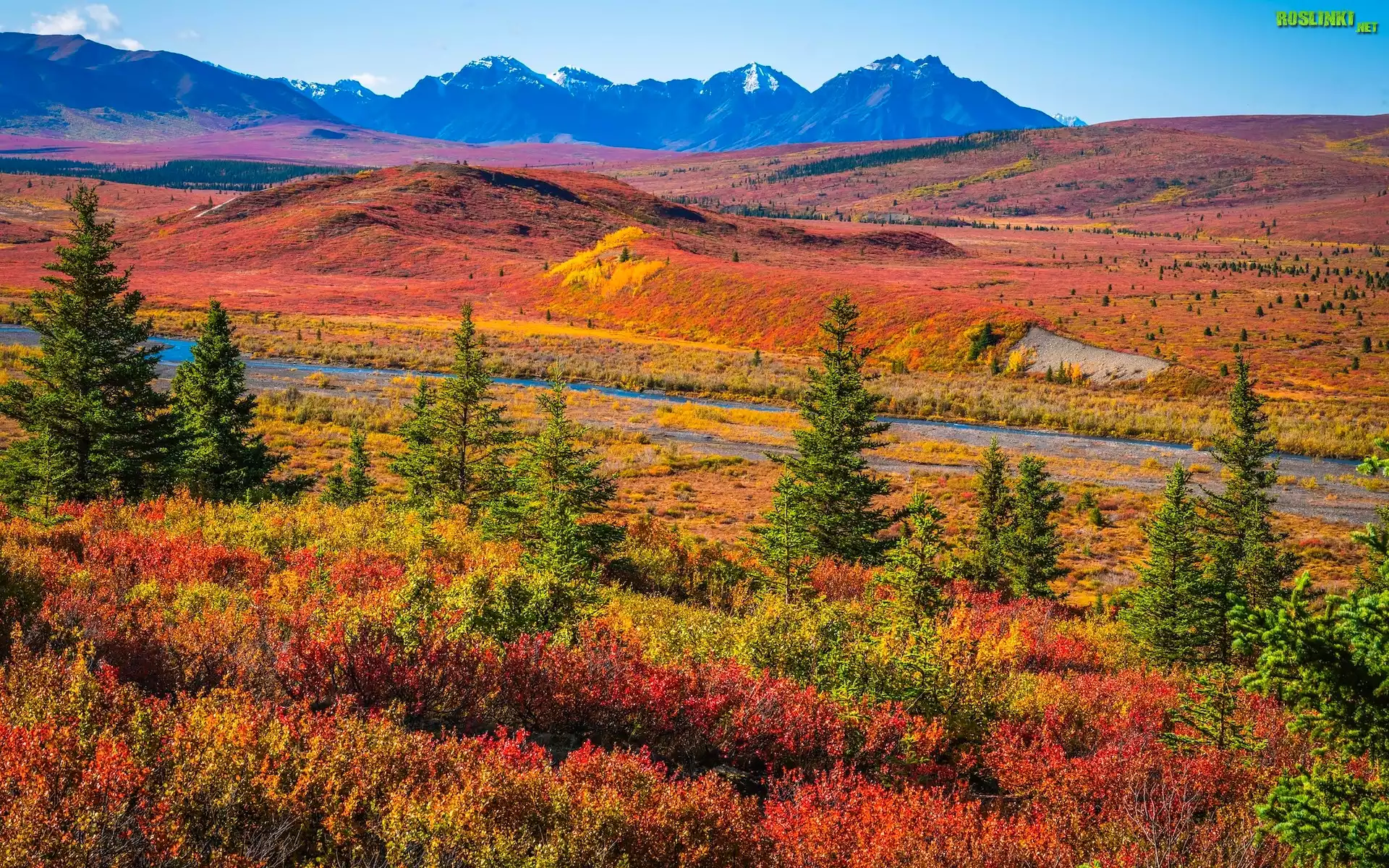 Rośliny: Stany Zjednoczone, Alaska, Park Narodowy Denali, Góry, Jesień, Drzewa, Droga