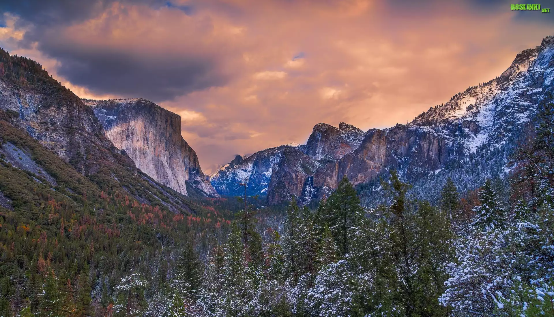 Stany Zjednoczone, Stan Kalifornia, Park Narodowy Yosemite, Dolina Yosemite Valley, Góry, El Capitan, Drzewa, Śnieg |