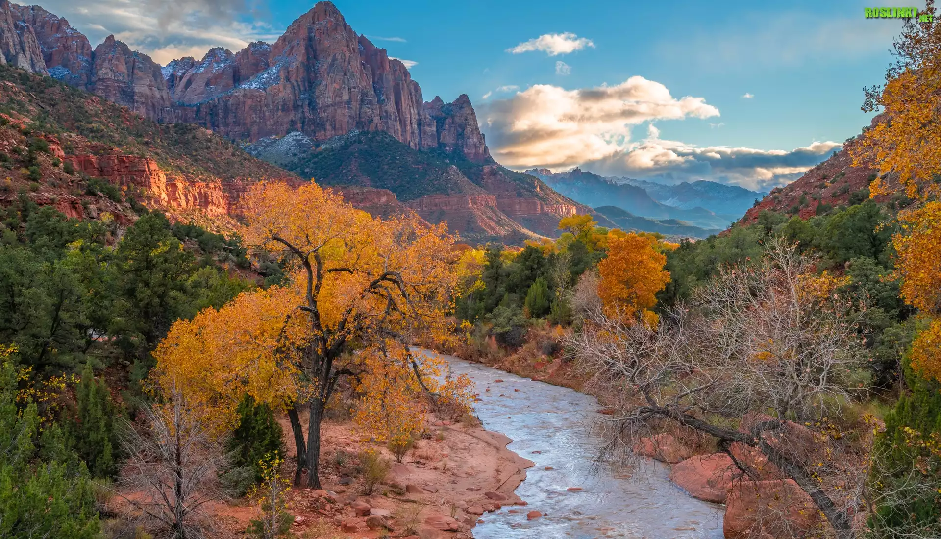 Stany Zjednoczone, Stan Utah, Park Narodowy Zion, Góry Watchman, Rzeka, Virgin River, Kamienie, Drzewa, Jesień |