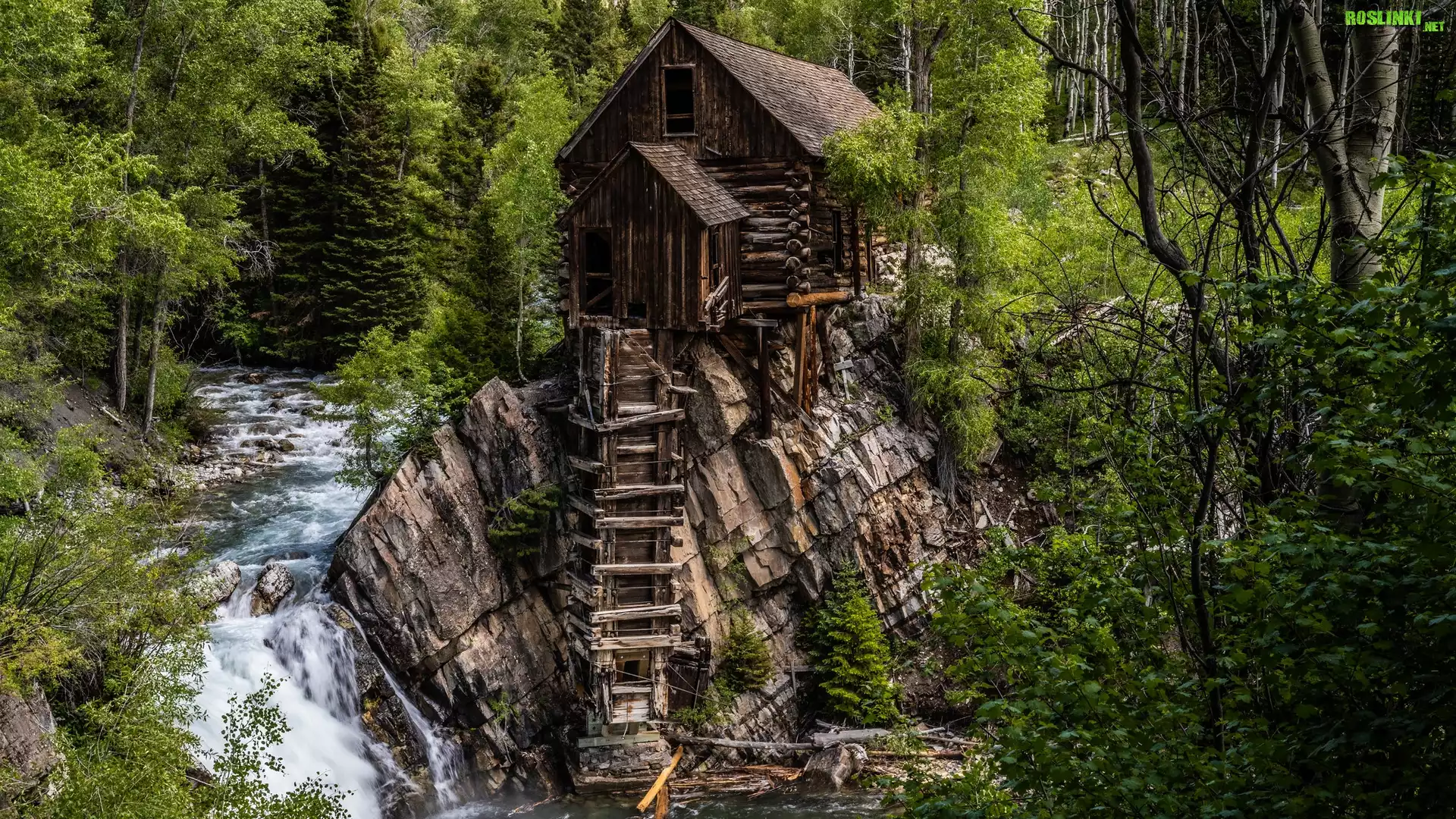 Stany Zjednoczone, Kolorado, Hrabstwo Gunnison, Rzeka Crystal River, Kryształowy Młyn, Crystal Mill, Wodospad, Wzgórza, Drzewa, Roślinność |