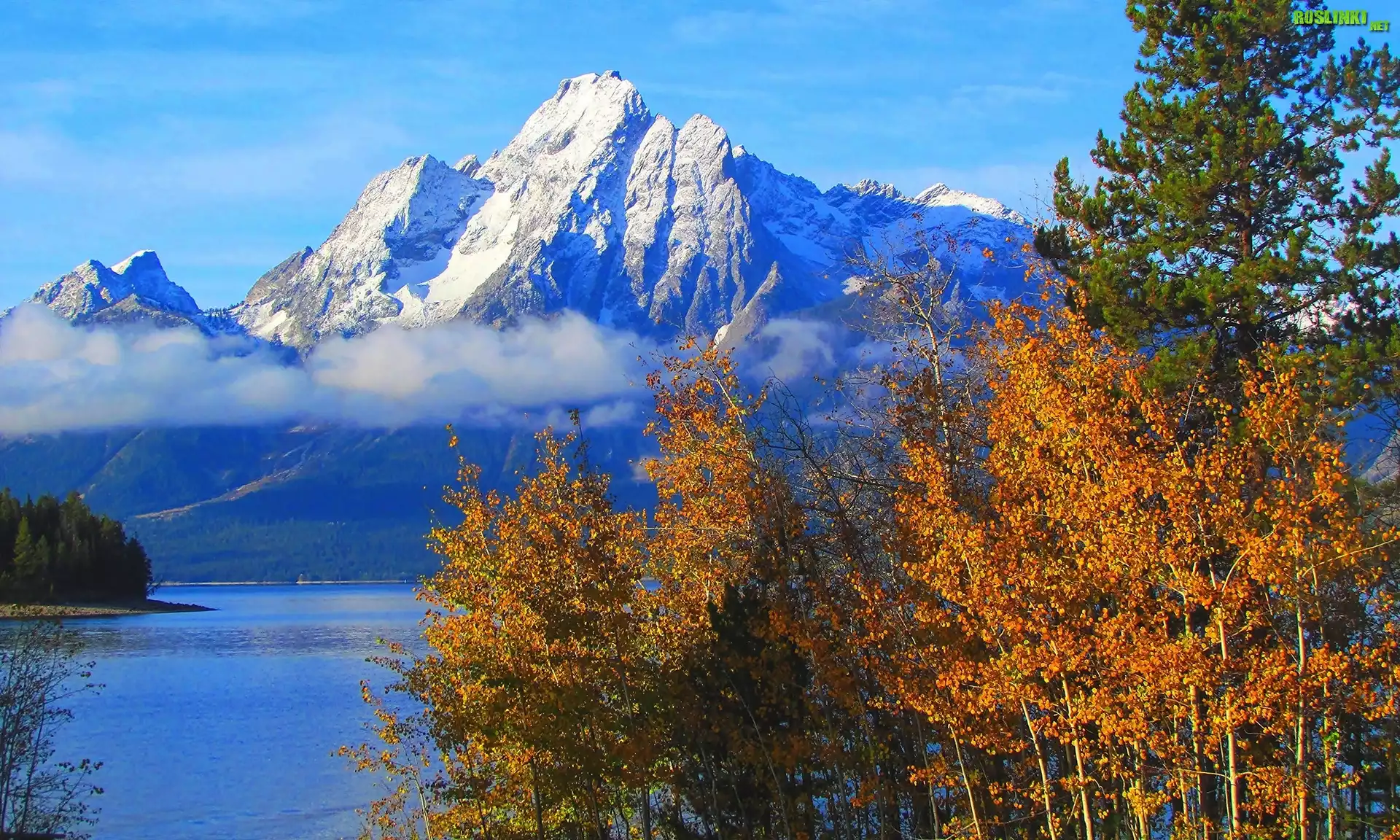 Stany Zjednoczone, Stan Wyoming, Park Narodowy Grand Teton, Góry, Szczyt Mount Moran, Drzewa, Jezioro Jackson Lake |