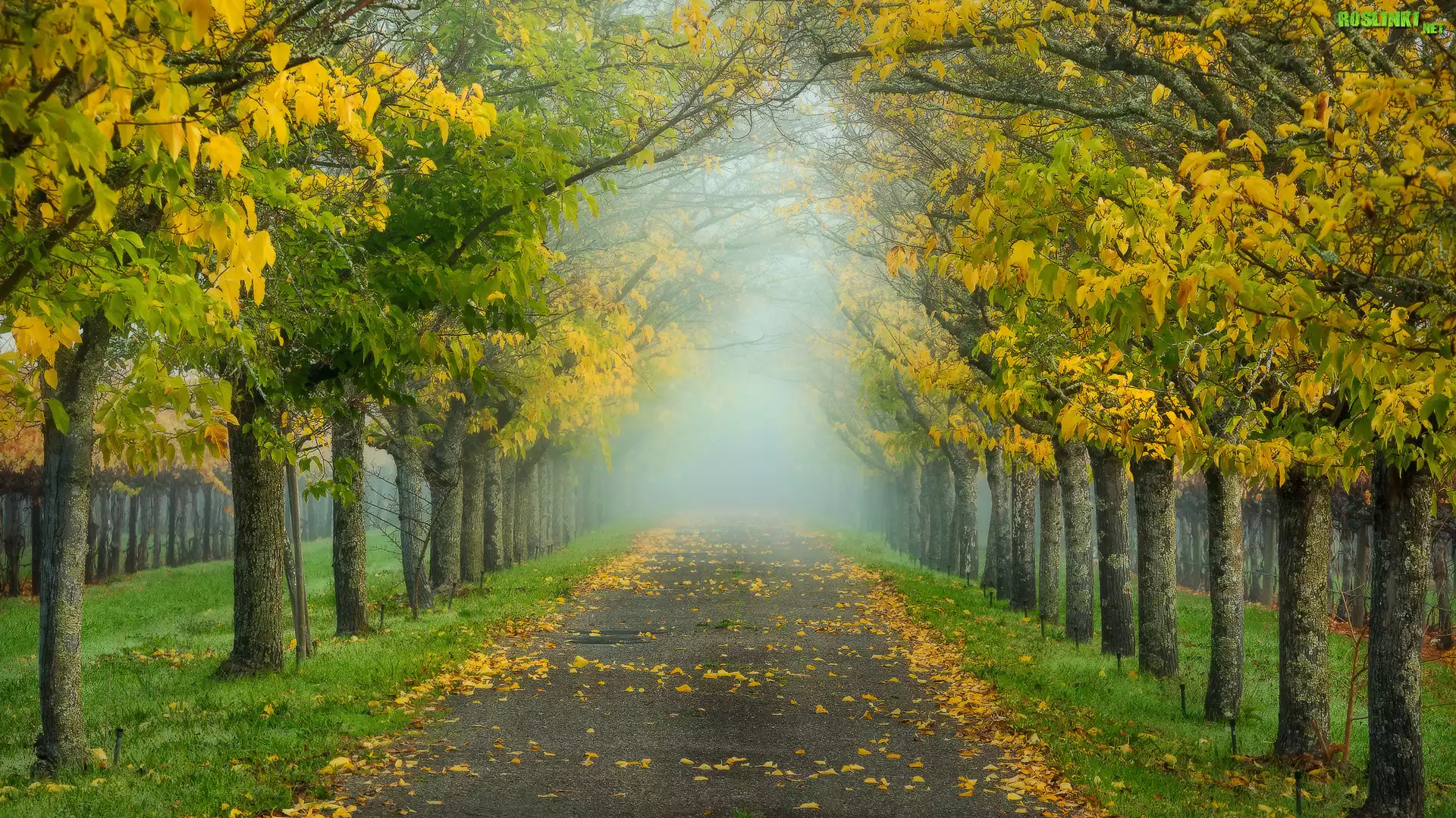 Stany Zjednoczone, Stan Kalifornia, Hrabstwo Napa, Calistoga, Jesień, Droga, Szpaler, Drzewa, Jabłonie, Mgła |