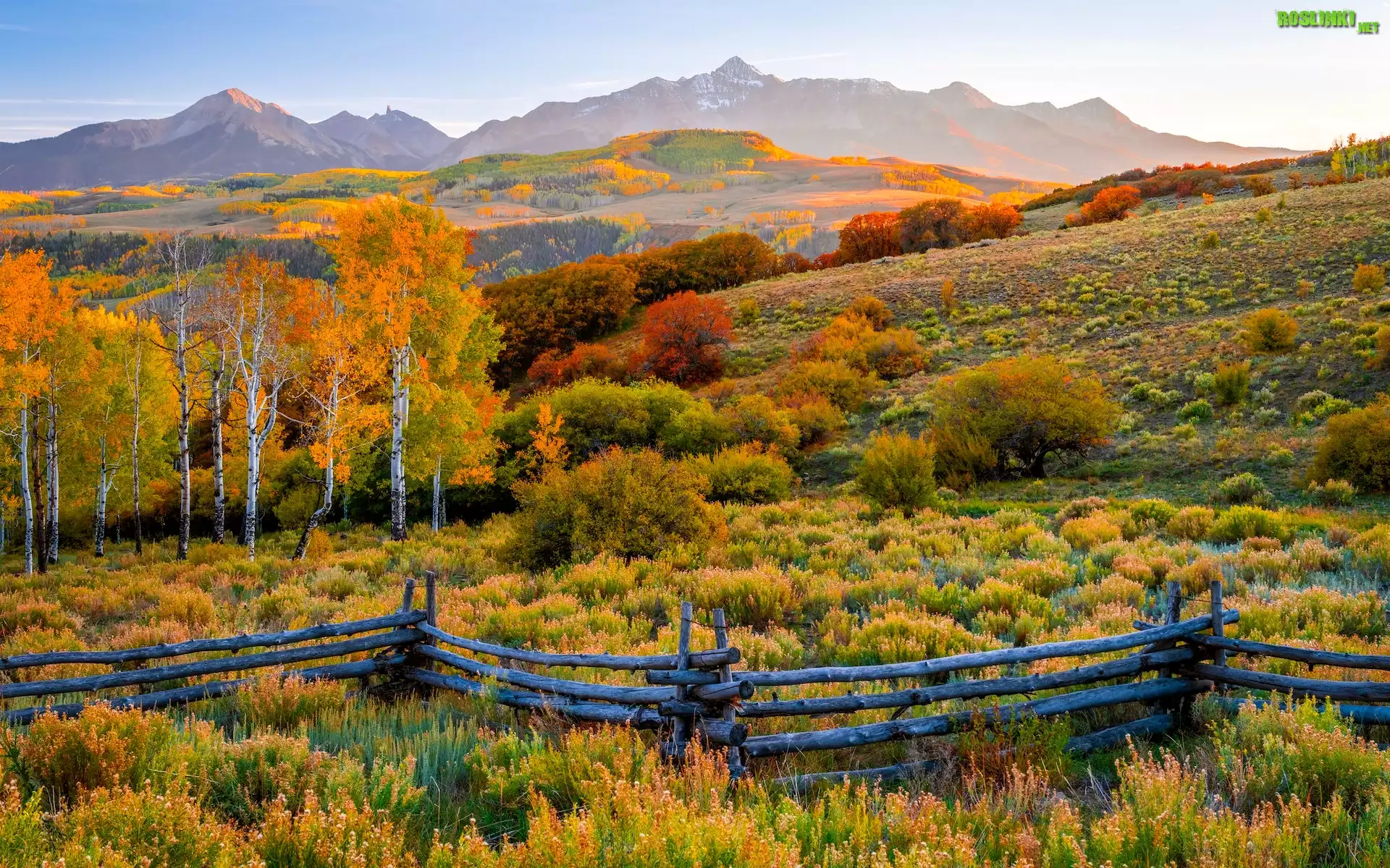 Stany Zjednoczone, Stan Kolorado, Telluride, Jesień, Góry, San Juan Mountains, Kolorowe, Drzewa, Ogrodzenie |