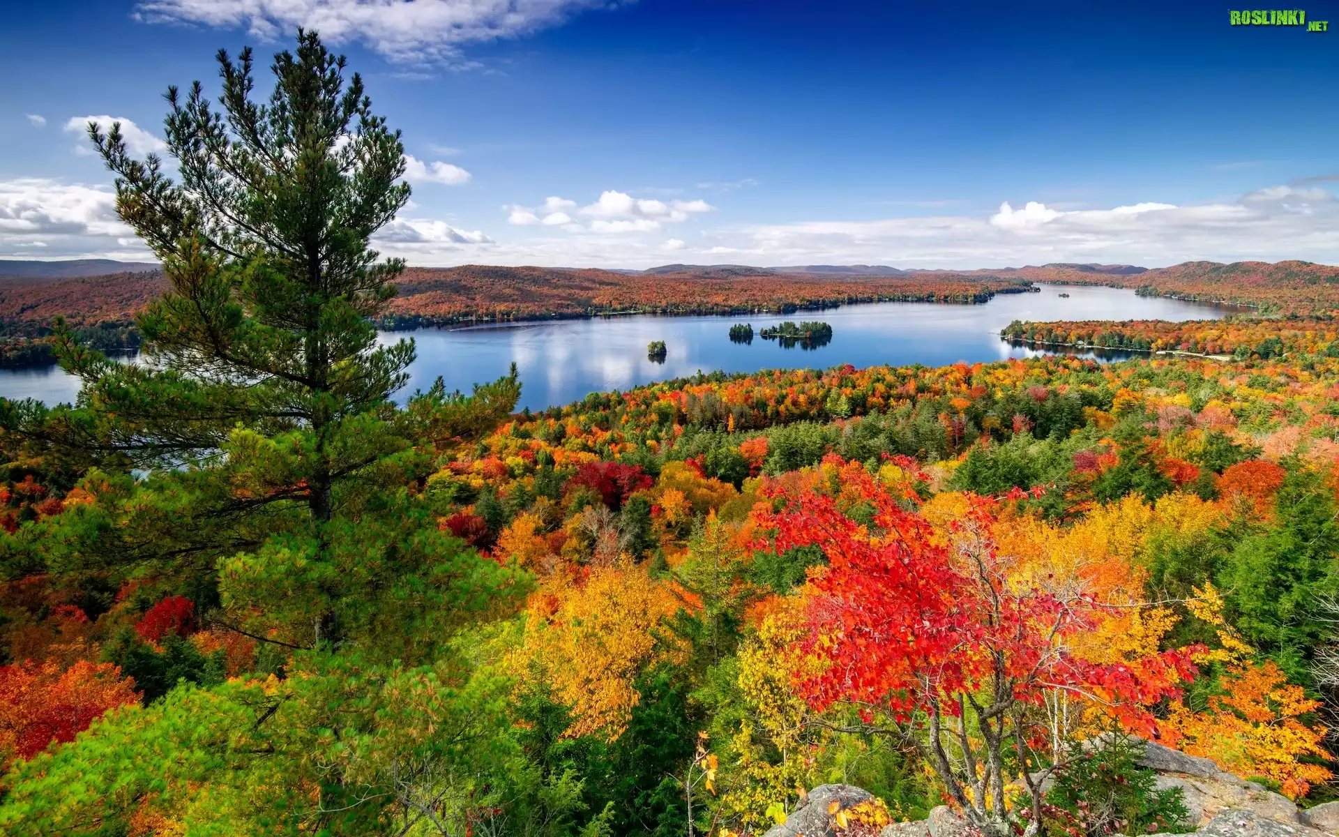 Rośliny: Stany Zjednoczone, Stan Nowy Jork, Jezioro, Las, Drzewa, Krzewy, Jesień