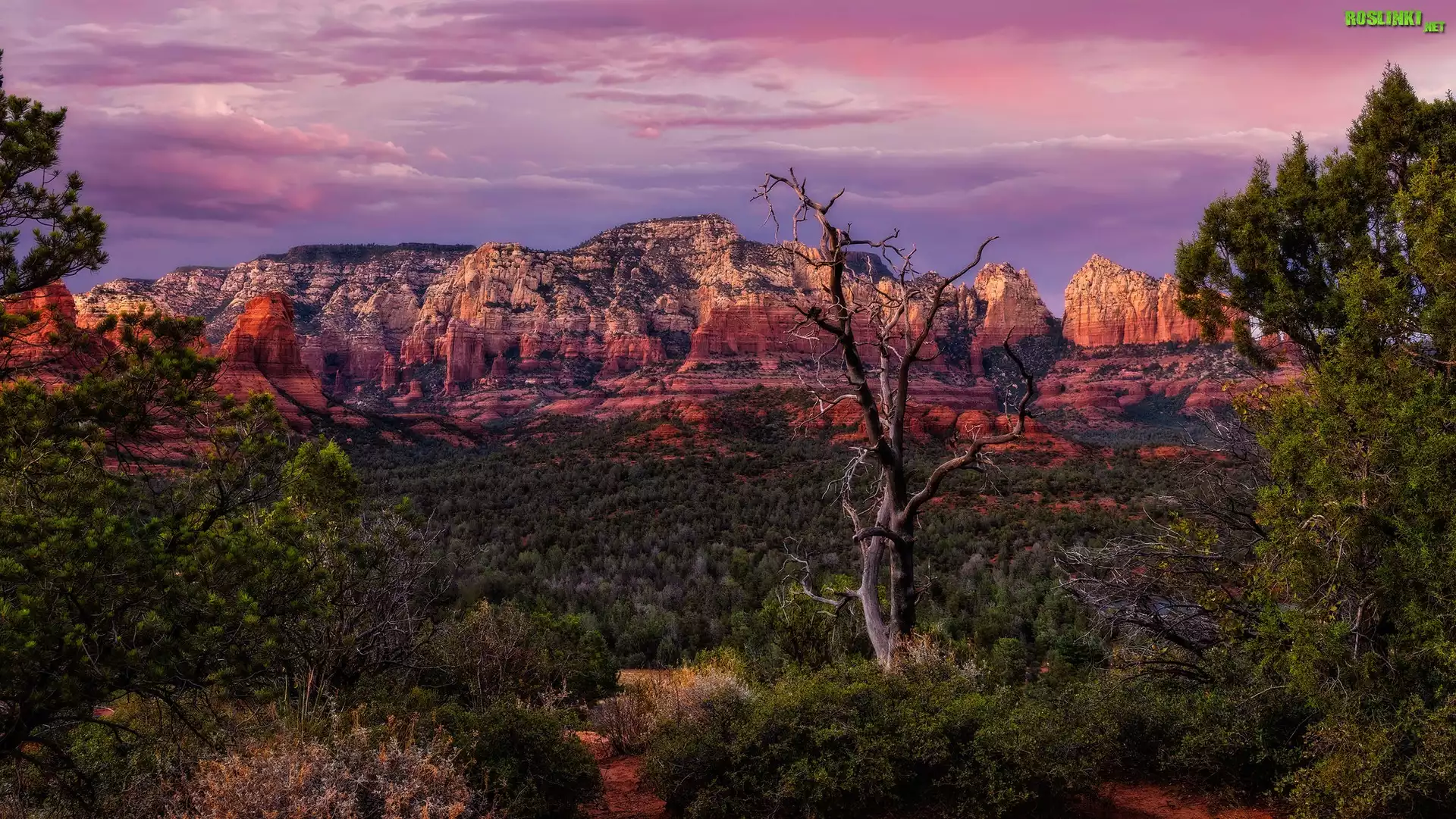 Stany Zjednoczone, Arizona, Sedona, Góry, Wilson Mountains, Skały, Drzewa