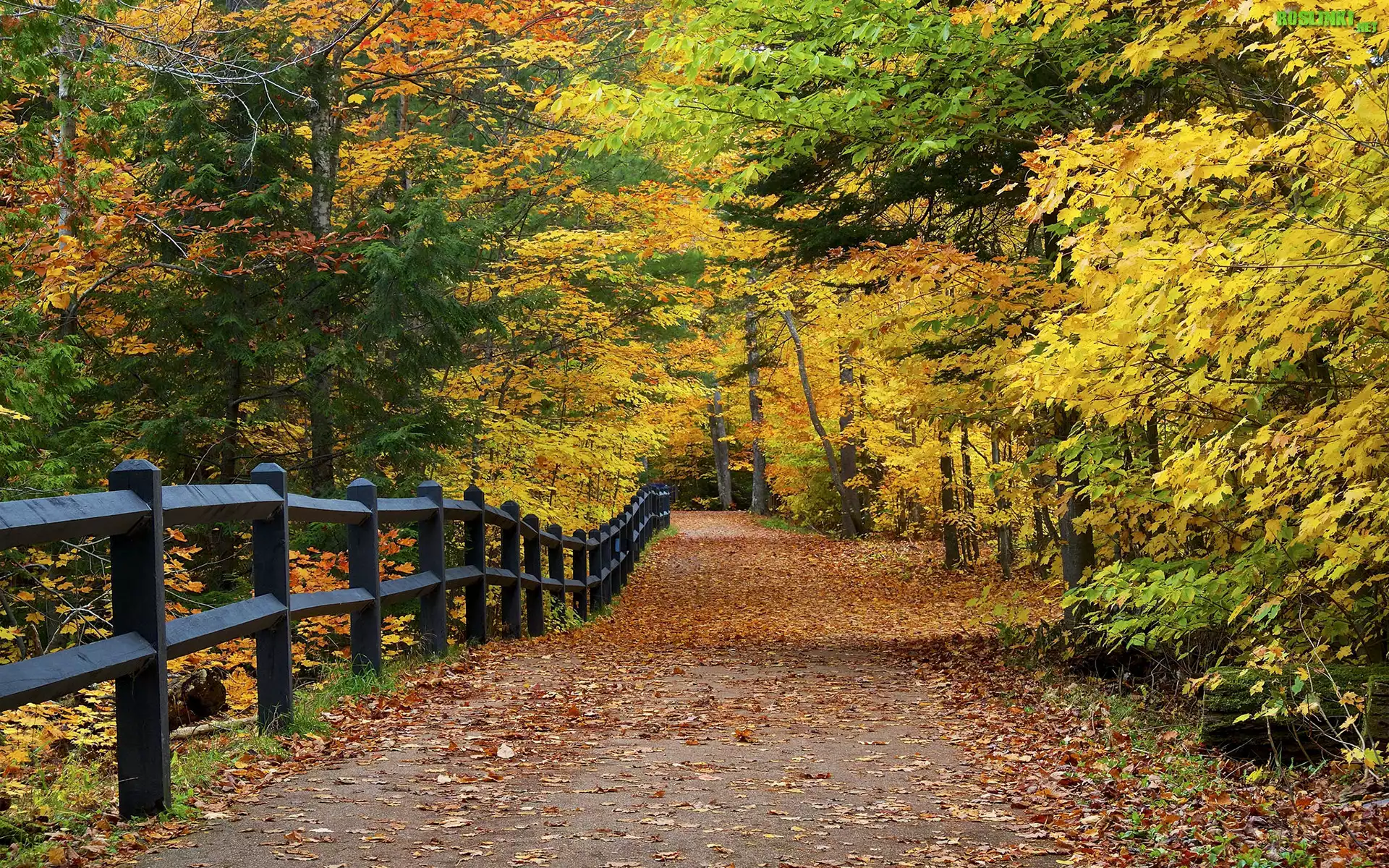 Stany Zjednoczone, Stan Michigan, Park Stanowy Tahquamnenon Falls State Park, Alejka, Drzewa, Liście, Ogrodzenie, Jesień |