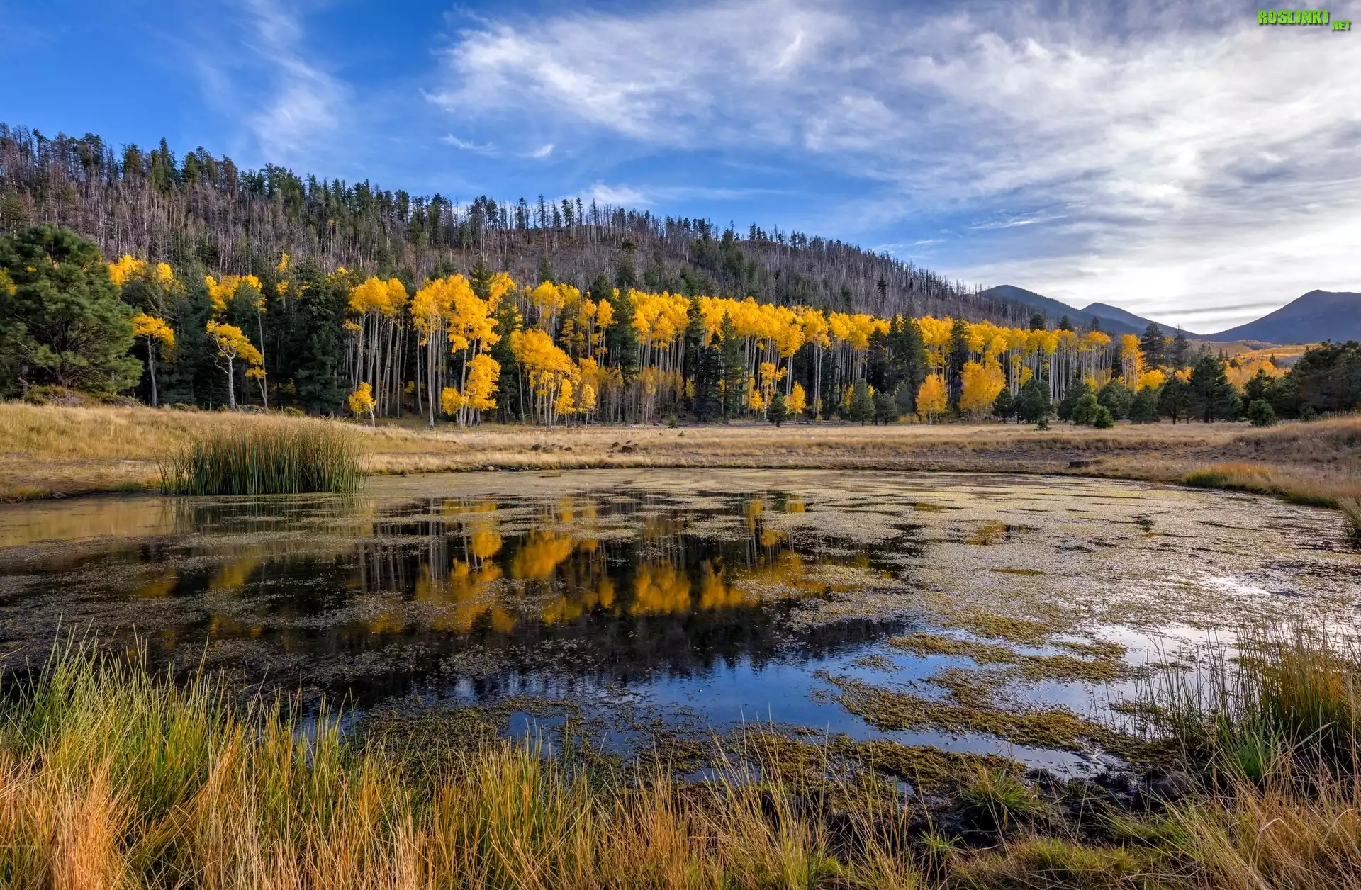 Stany Zjednoczone, Stan Arizona, Hrabstwo Coconino, Wzgórza San Francisco Peaks, Kemping Lockett Meadow, Jesień, Drzewa, Rozlewisko, Trawy |