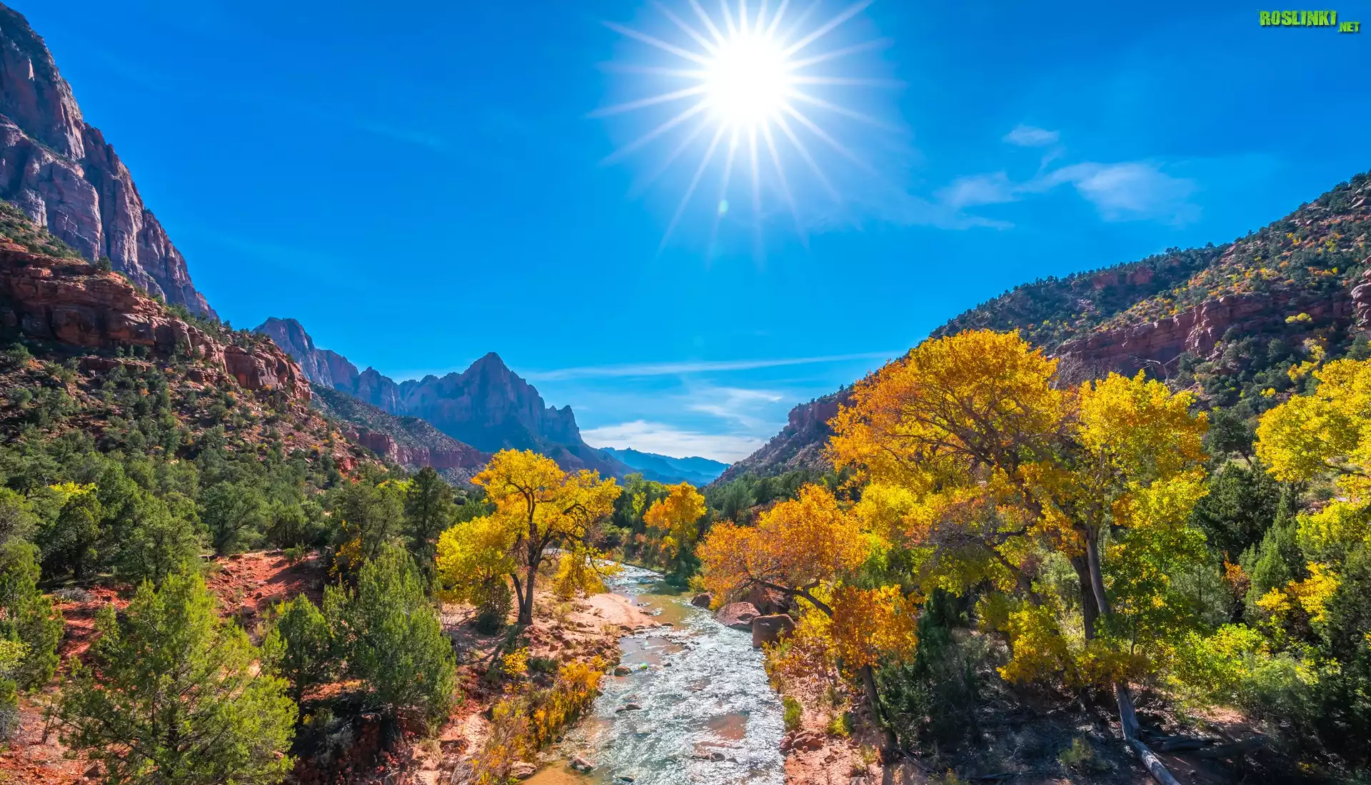 Stany Zjednoczone, Stan Utah, Park Narodowy Zion, Góry Watchman, Rzeka Virgin River, Kamienie, Drzewa, Promienie słońca |