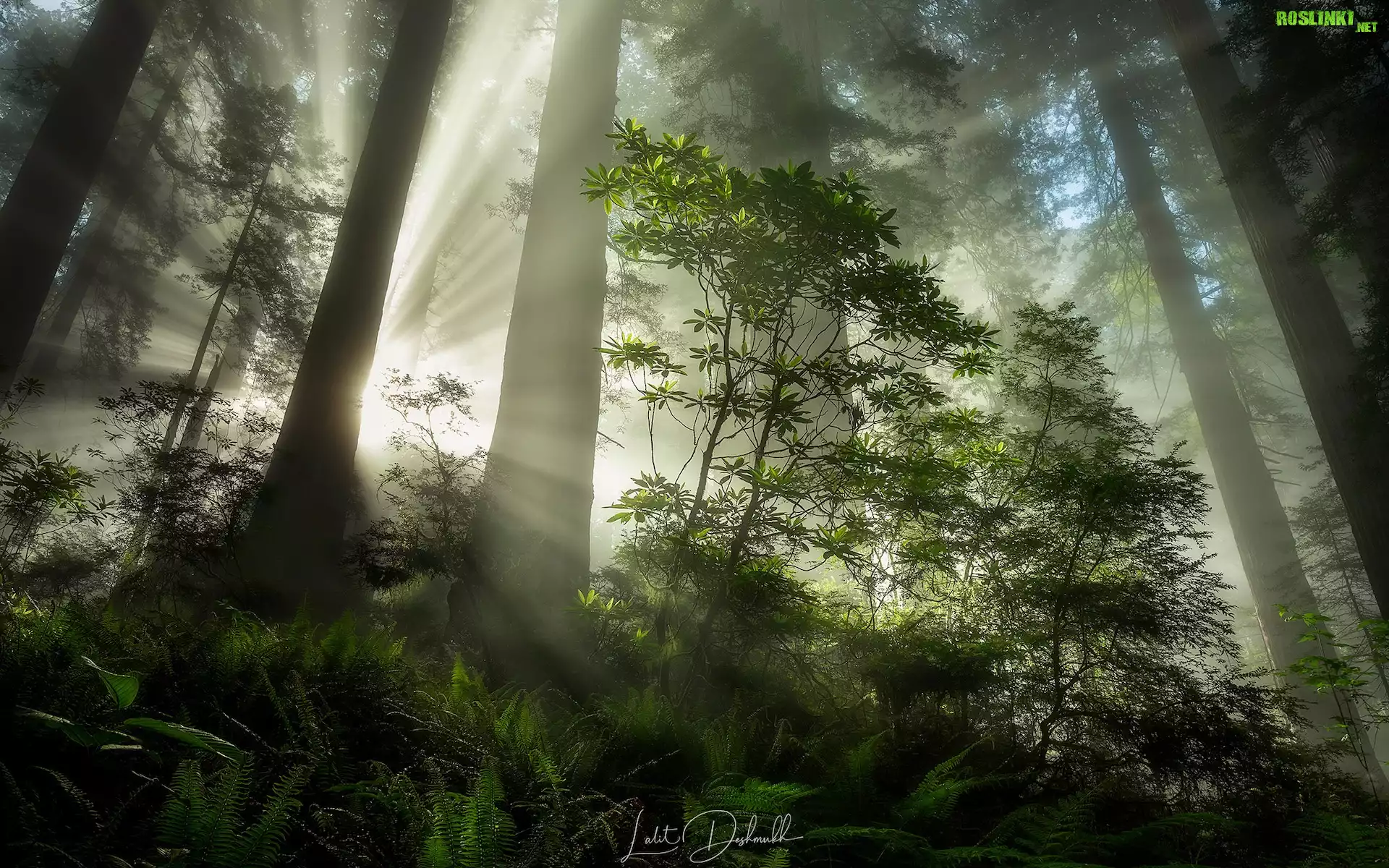 Stany Zjednoczone, Kalifornia, Park Narodowy Redwood, Drzewa, Rododendron, Przebijające światło