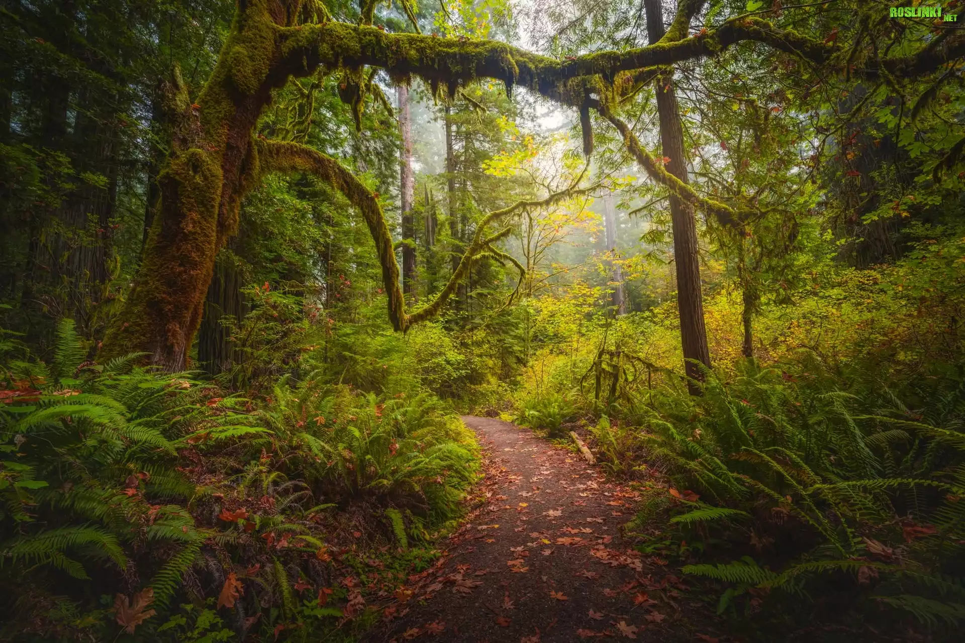 Rośliny: Stany Zjednoczone, Kalifornia, Park Narodowy Redwood, Omszałe, Drzewa, Ścieżka, Paprocie