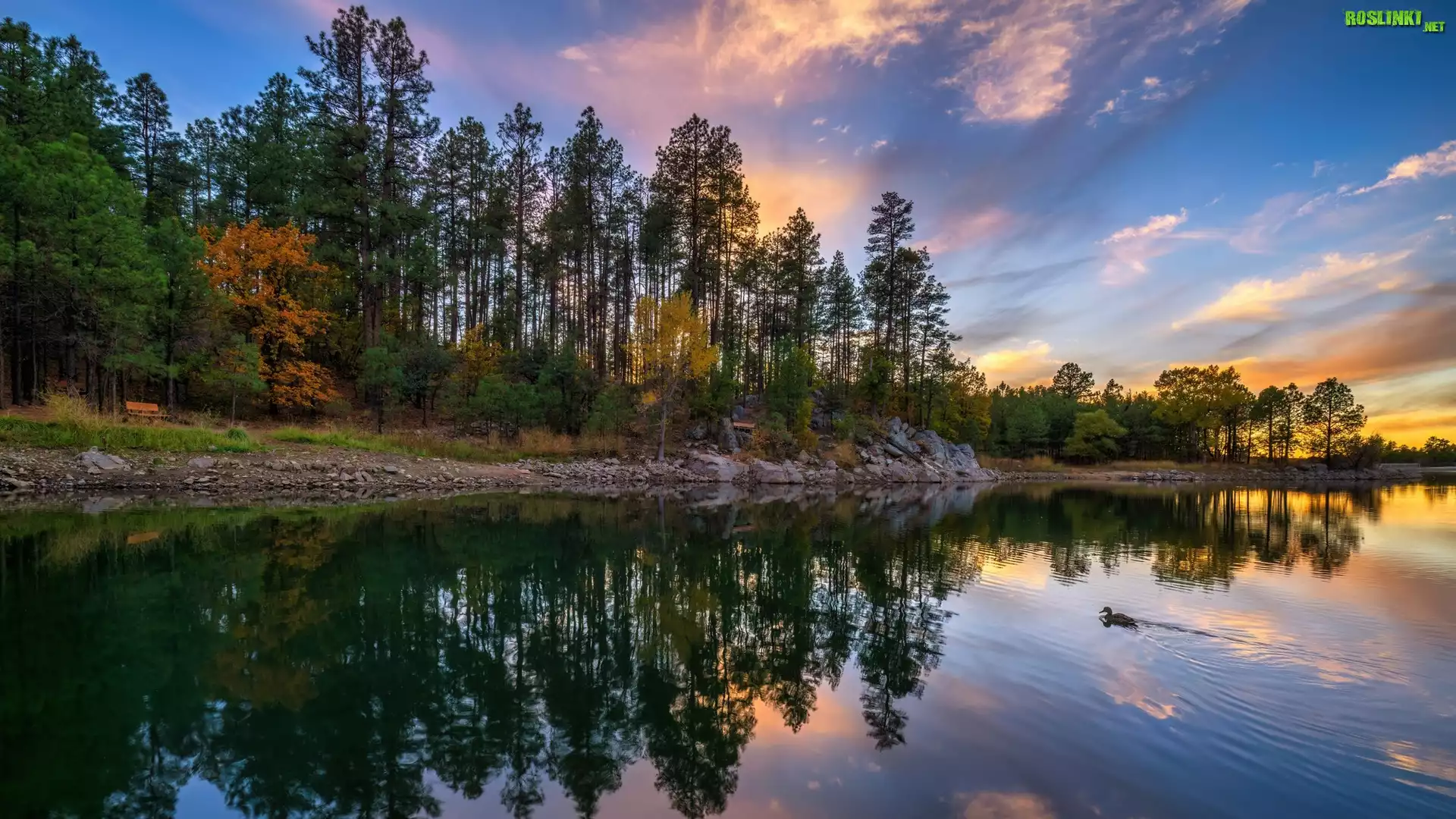 Rośliny: Stany Zjednoczone, Arizona, Jezioro, Goldwater Lake, Drzewa, Zachód Słońca, Odbicie