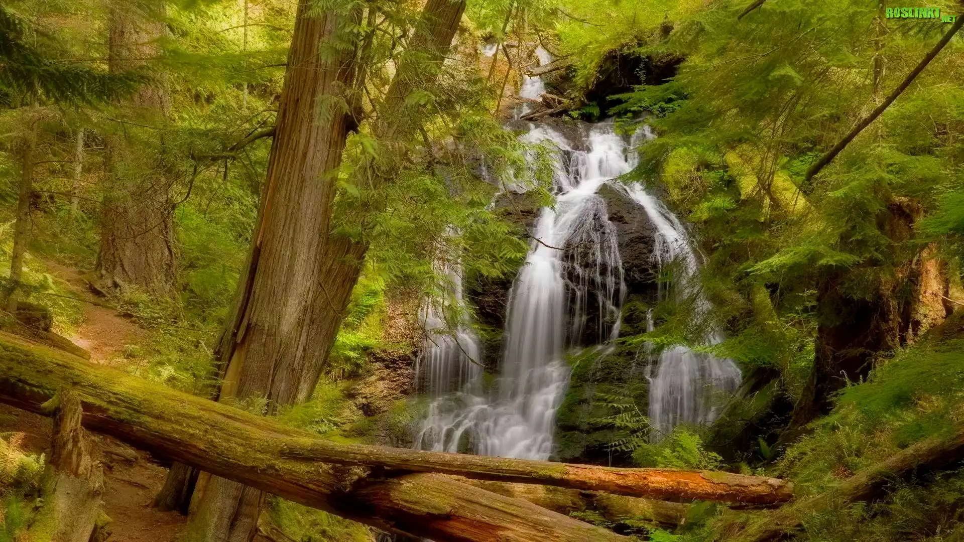 Stany Zjednoczone, Stan Waszyngton, Wyspa Orcas, Park stanowy Moran State Park, Las, Drzewa, Wodospad kaskadowy, Powalone, Kłody |