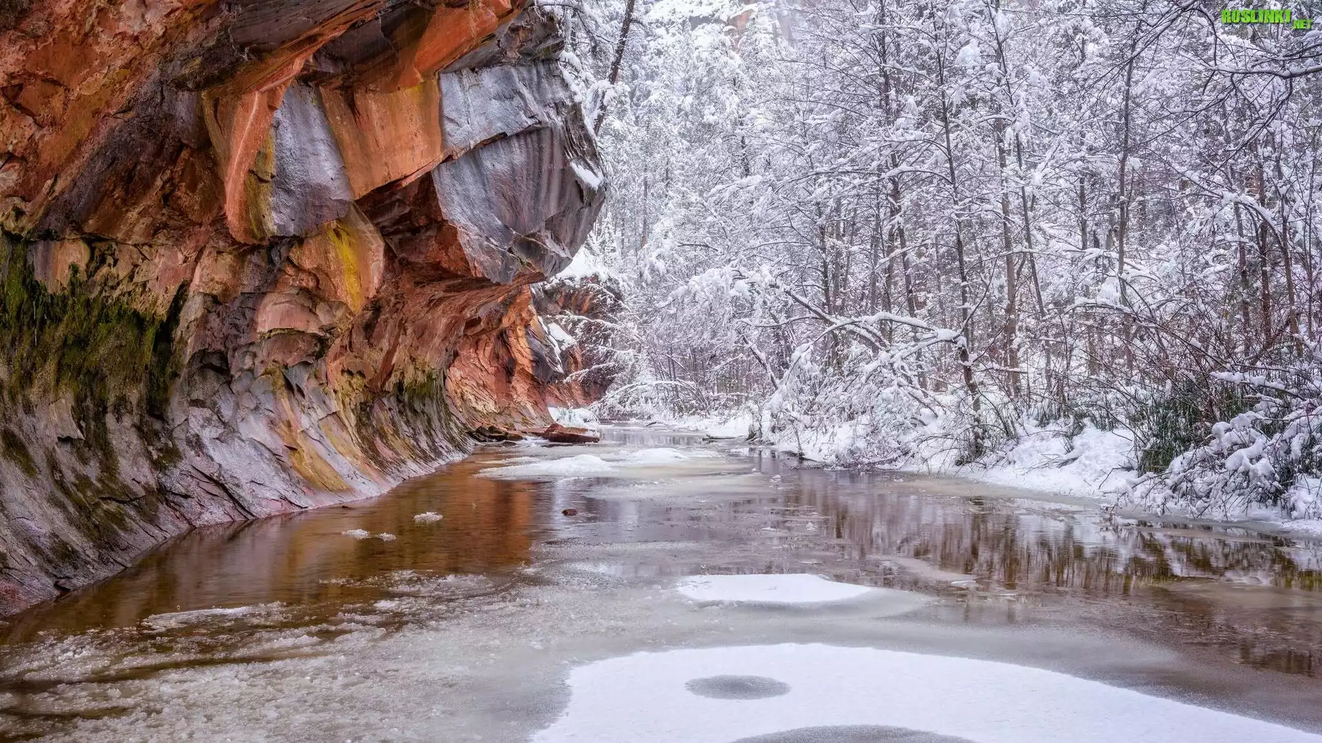Stany Zjednoczone, Arizona, Sedona, Rzeka Oak Creek, Szlak West Fork Oak Creek Trail, Zima, Skały, Ośnieżone, Drzewa |
