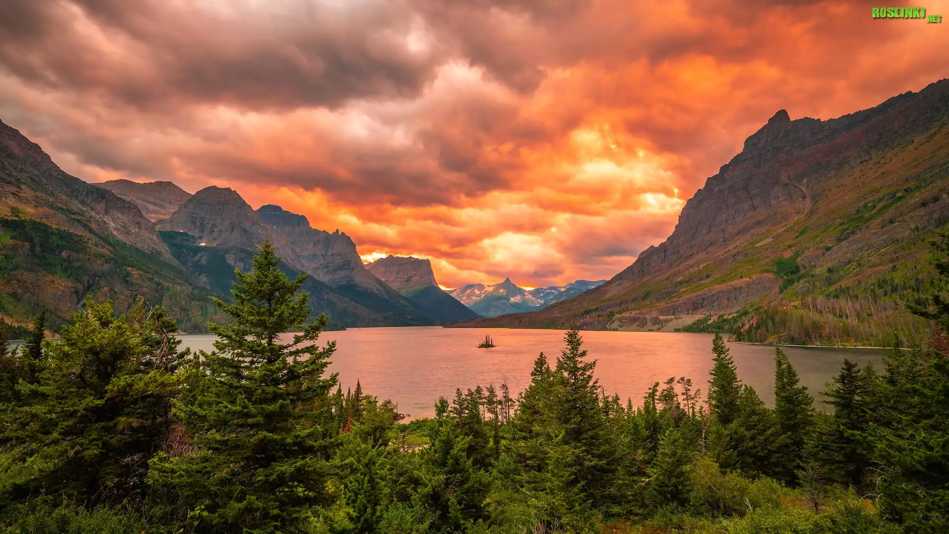 Stany Zjednoczone, Stan Montana, Park Narodowy Glacier, Drzewa, Góry, Jezioro, Saint Mary Lake, Chmury, Zachód słońca |