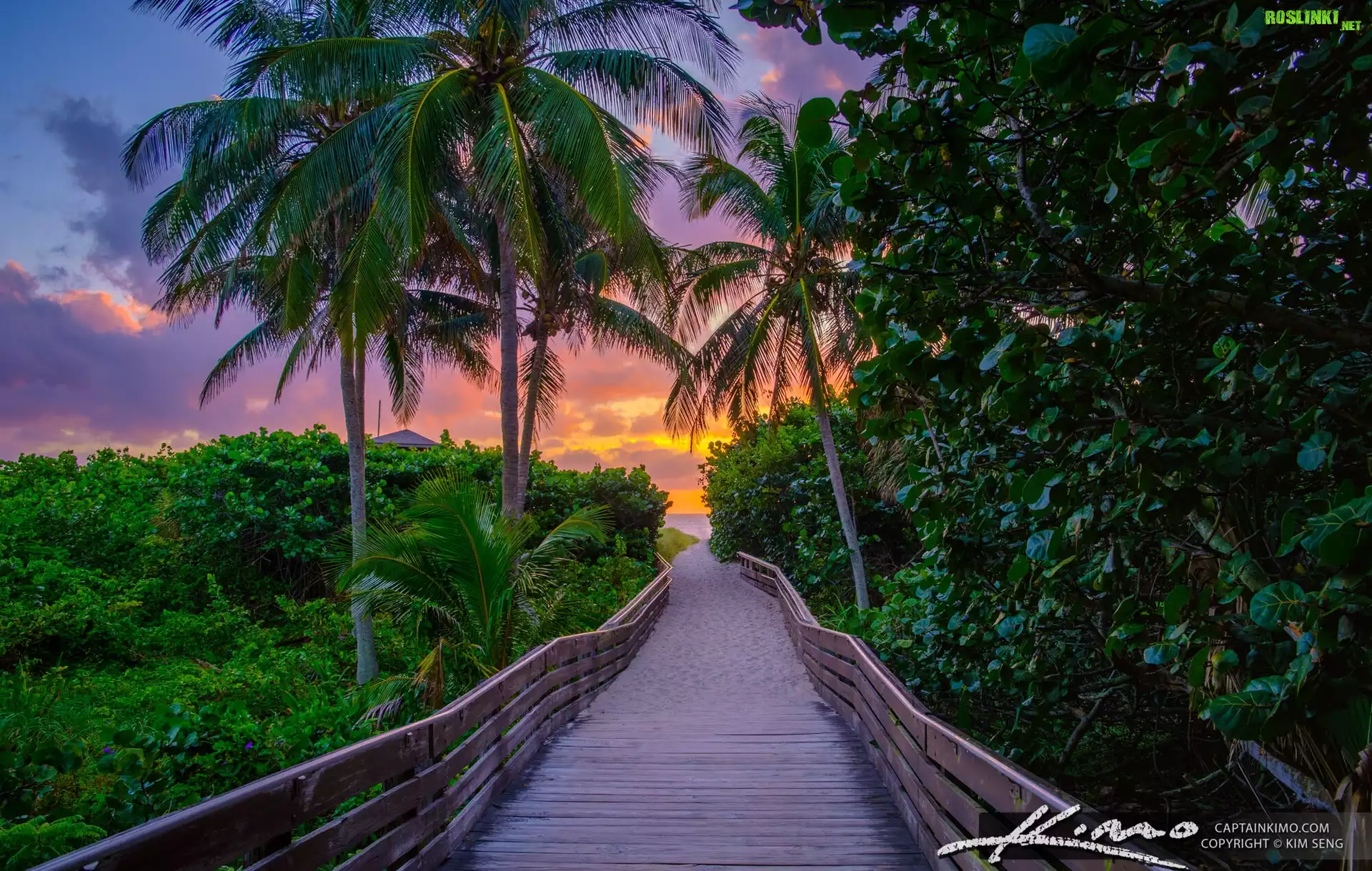 Rośliny: Stany Zjednoczone, Floryda, Pomost, Palmy, Roślinność, Zachód słońca, Chmury