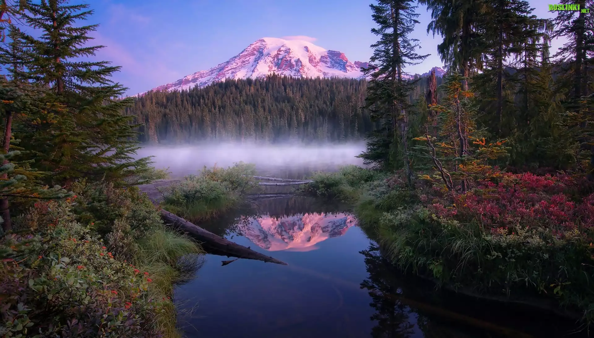 Stany Zjednoczone, Stan Waszyngton, Park Narodowy Mount Rainier, Jezioro Reflection Lakes, Szczyt Mount Rainier, Góra, Las, Drzewa, Mgła |