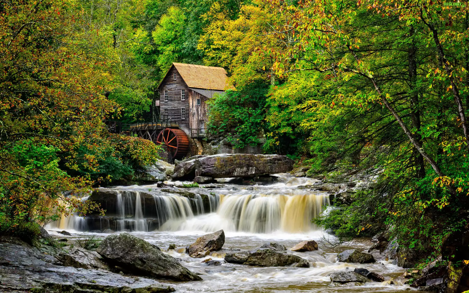 Stany Zjednoczone, Wirginia Zachodnia, Park Babcock State, Młyn, Glade Creek Grist Mill, Drzewa, Rzeka New River Gorge, Kamienie |