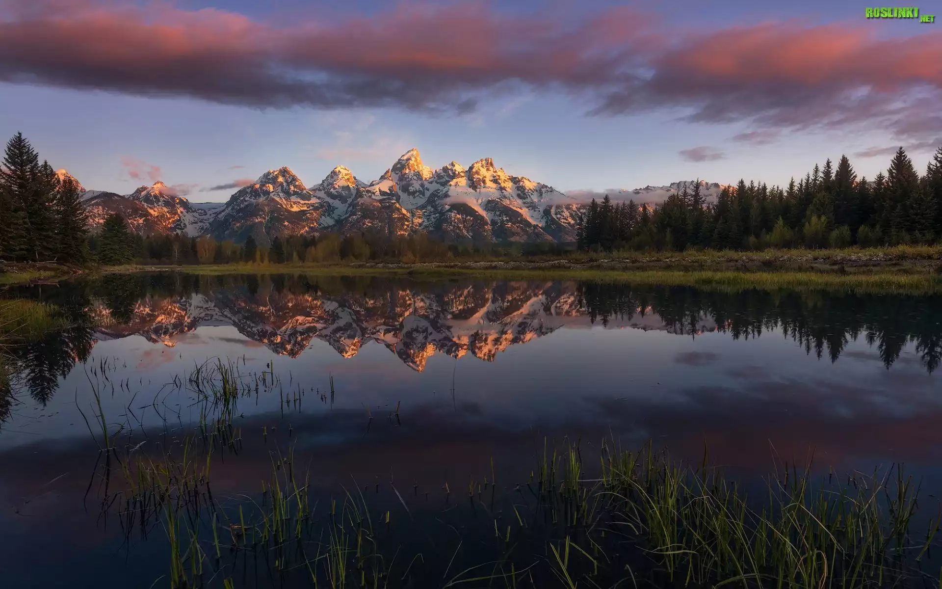 Stany Zjednoczone, Stan Wyoming, Park Narodowy Grand Teton, Ośnieżone, Góry Skaliste, Szczyt Grand Teton, Las, Drzewa, Jezioro, Odbicie |