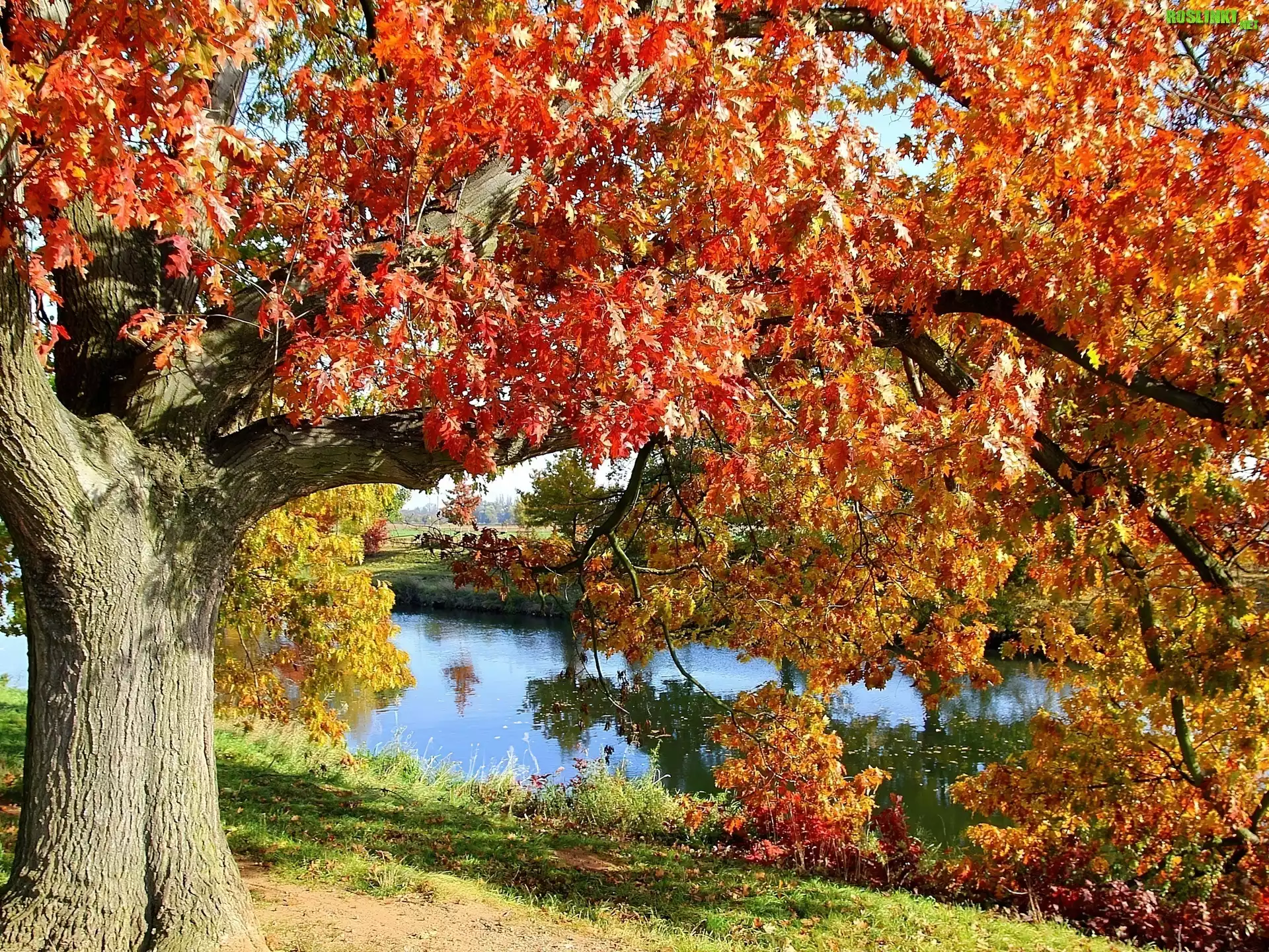 Rośliny: Stary, Jesienny, Dąb, Rzeka