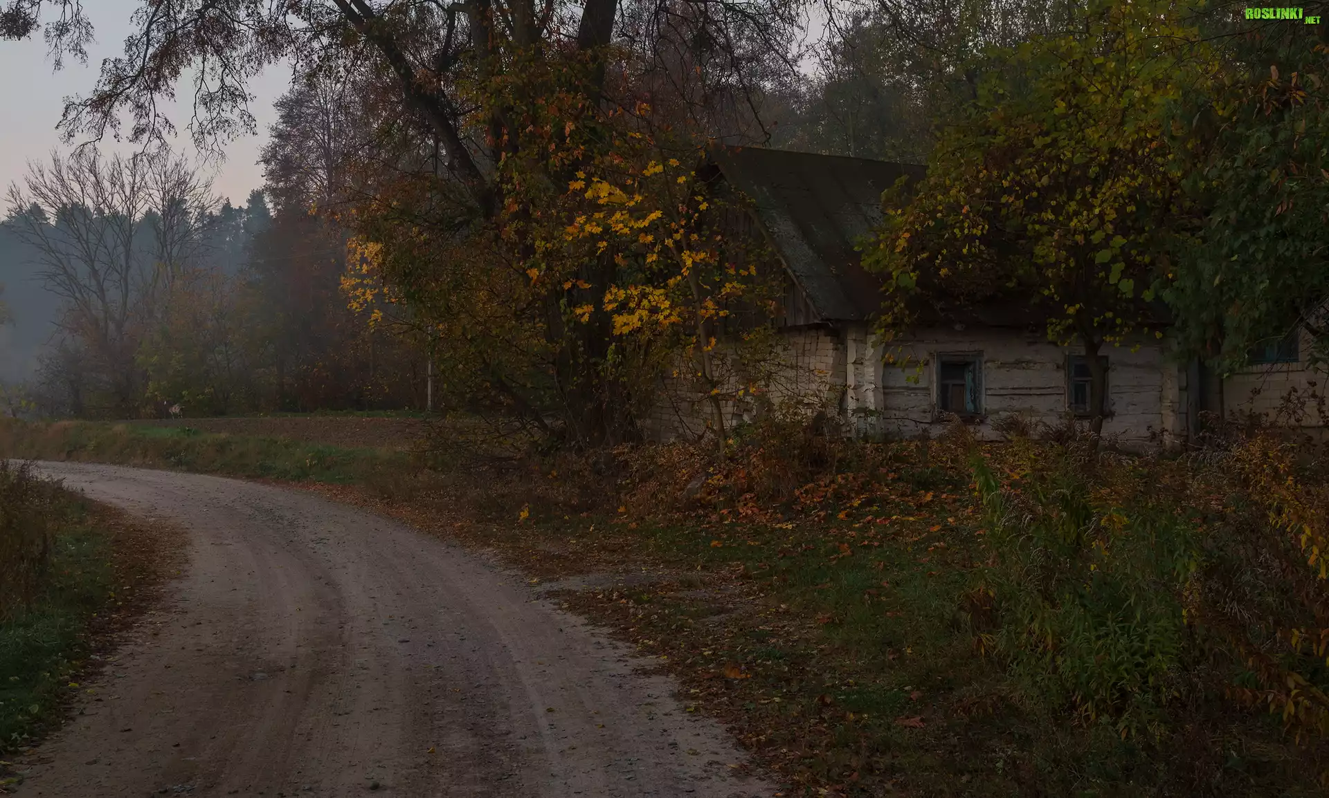 Rośliny: Stary, Drewniany, Domek, Droga, Drzewa, Jesień
