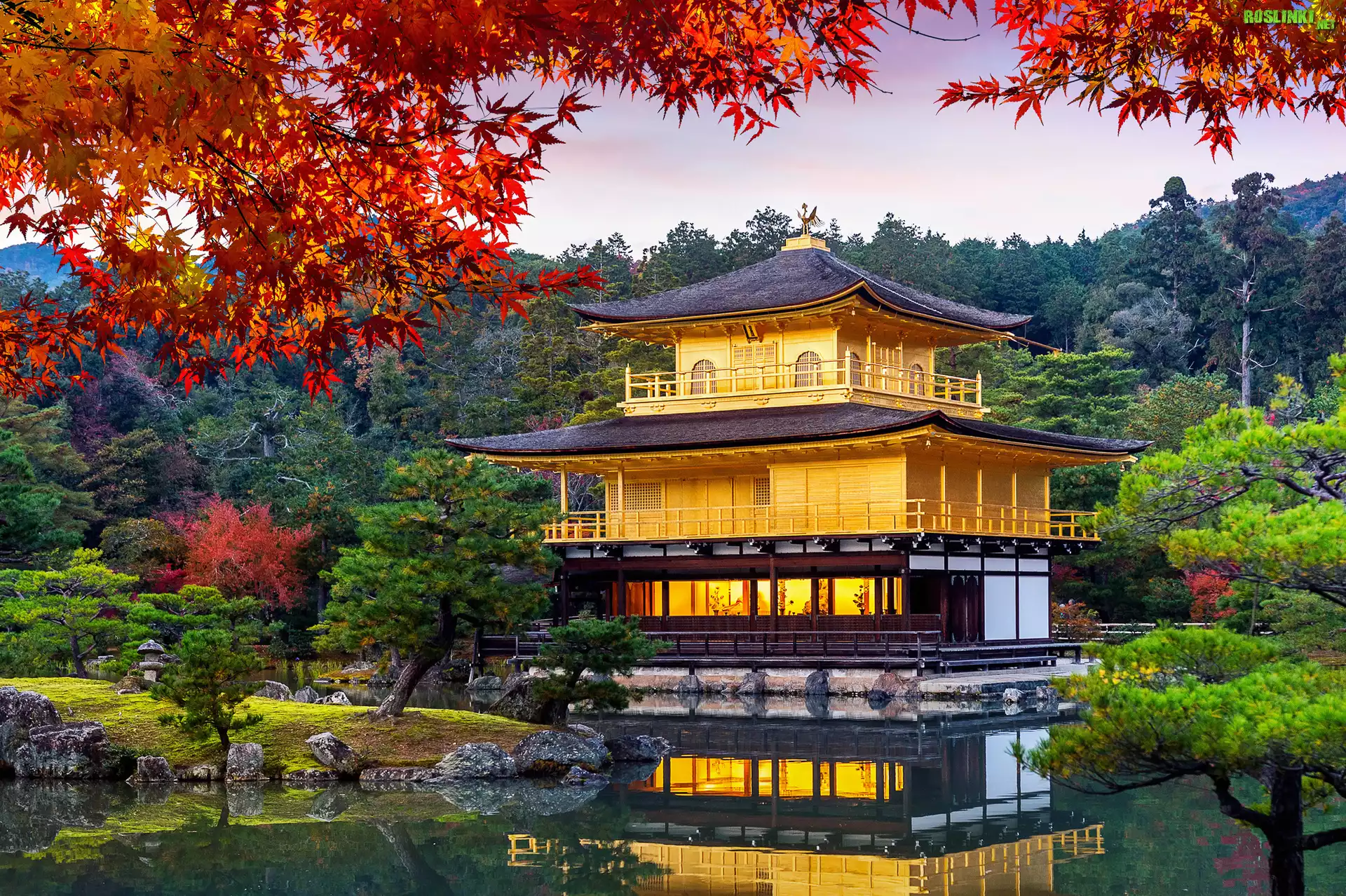 Rośliny: Świątynia Kinkakuji, Złoty Pawilon, Staw Kyko chi, Liście, Drzewa, Kioto, Japonia