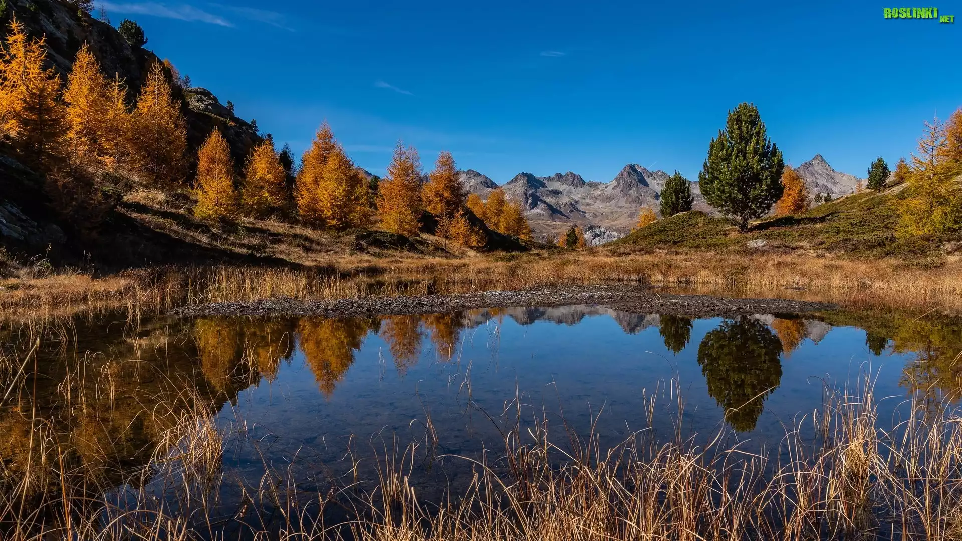 Rośliny: Jesień, Góry, Brązowe, Drzewa, Modrzewie, Sucha, Trawa, Staw