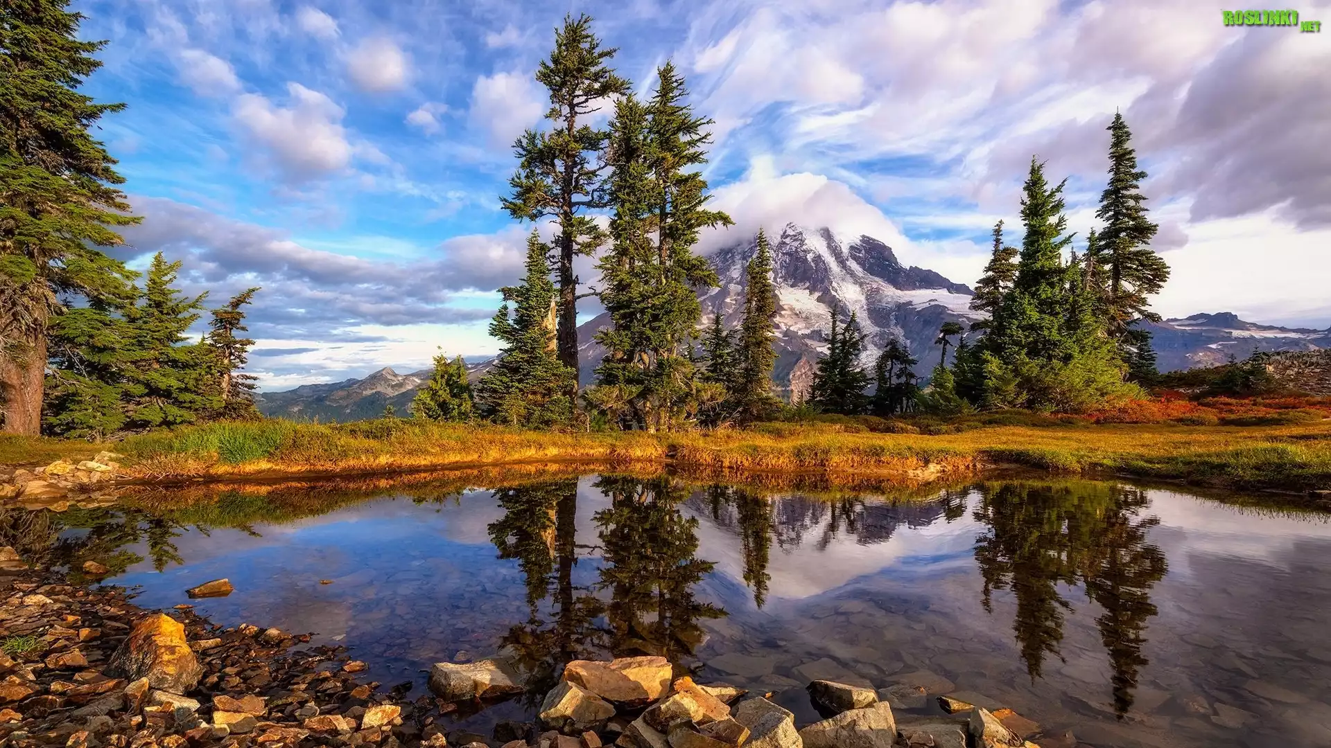 Rośliny: Góry, Staw, Chmury, Mgła, Kamienie, Drzewa, Odbicie