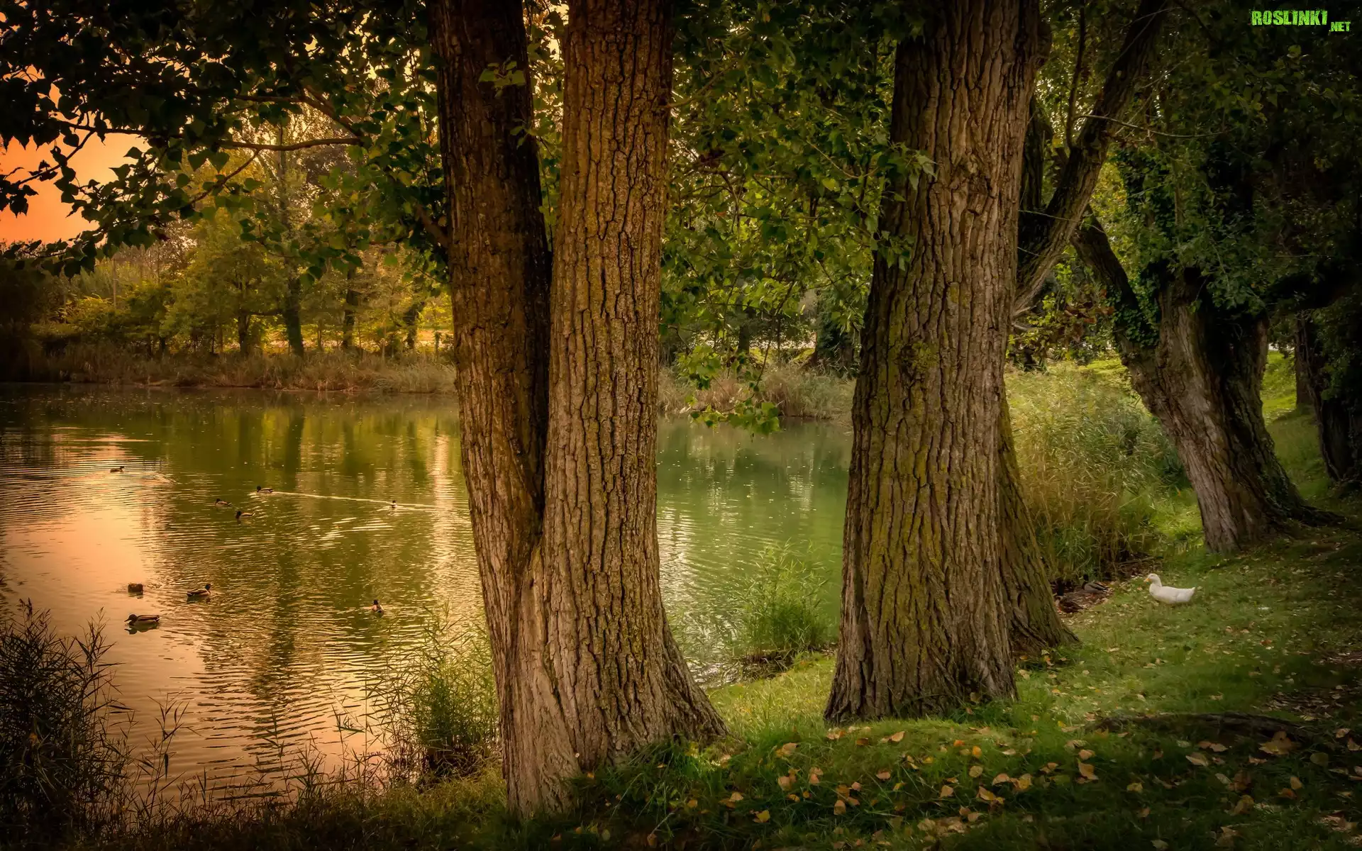 Rośliny: Staw, Kaczki, Drzewa, Liście, Jesień