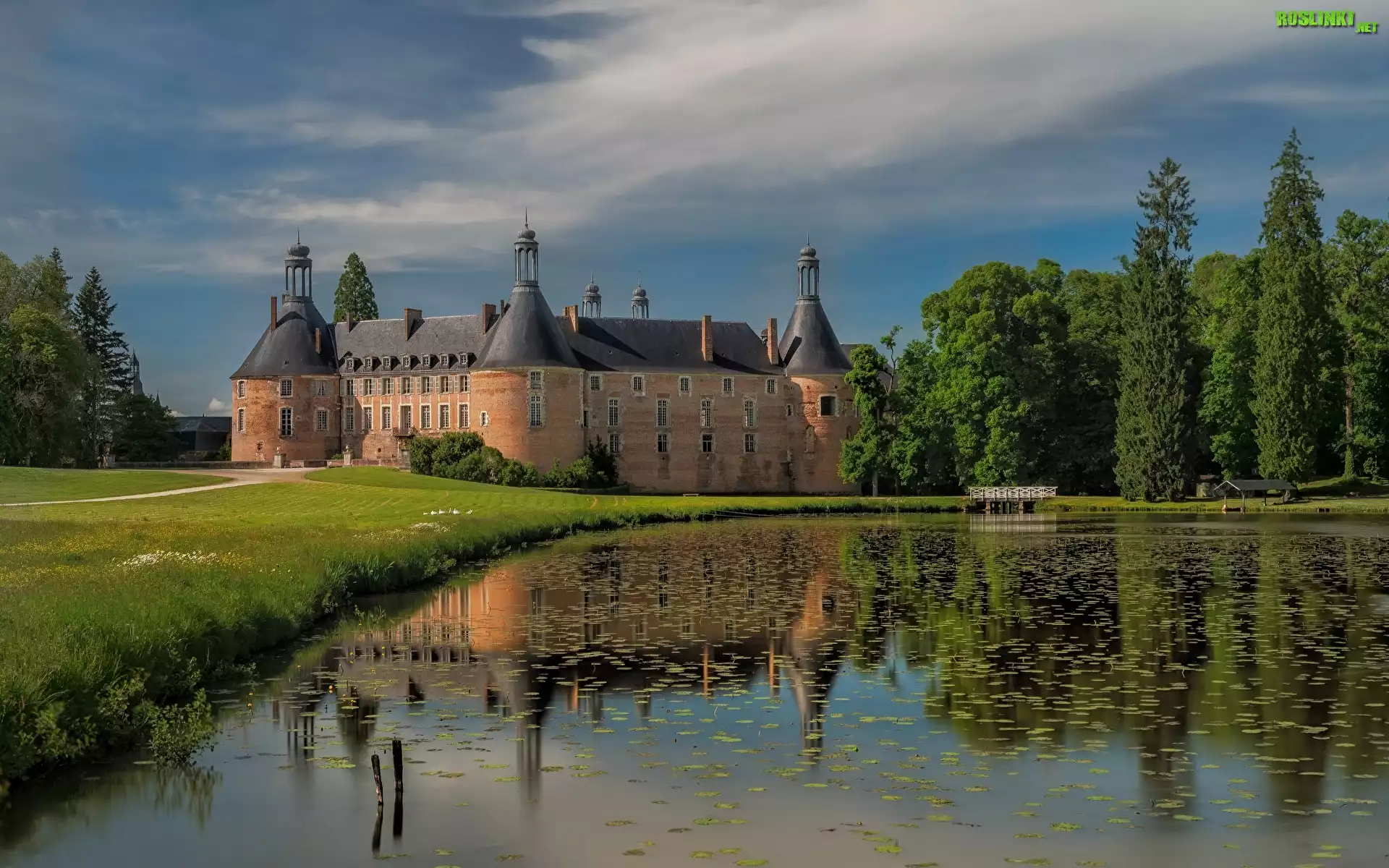 Rośliny: Park, Zamek, Castle Saint Fargean, Staw, Odbicie, Drzewa, Zieleń, Chmury, Burgundia, Francja