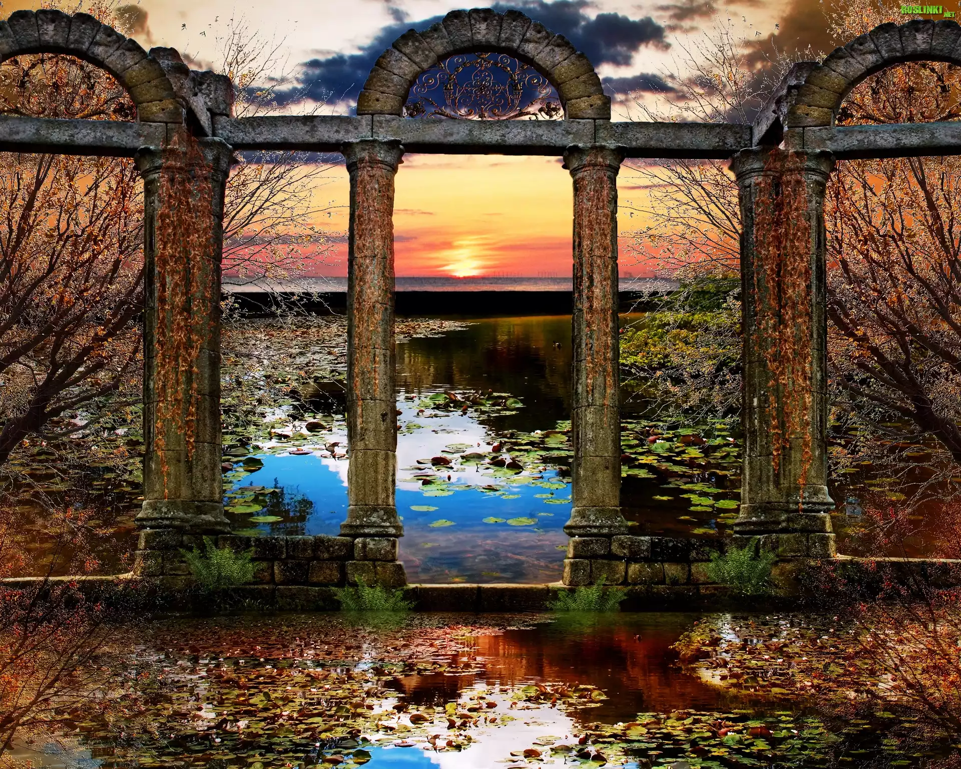 Rośliny: Park, Staw, Arkada, Jezioro, Zachód, Słońca, Rośliny