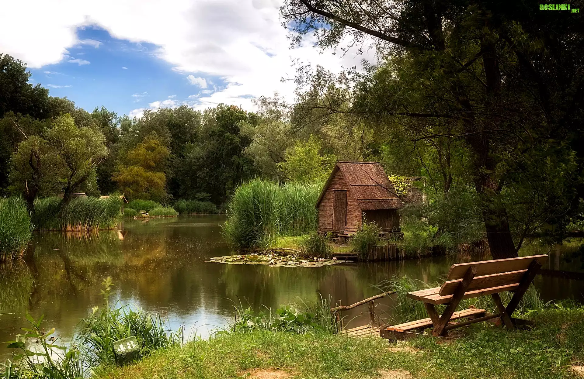 Rośliny: Staw, Domki, Ławka, Rośliny, Drzewa