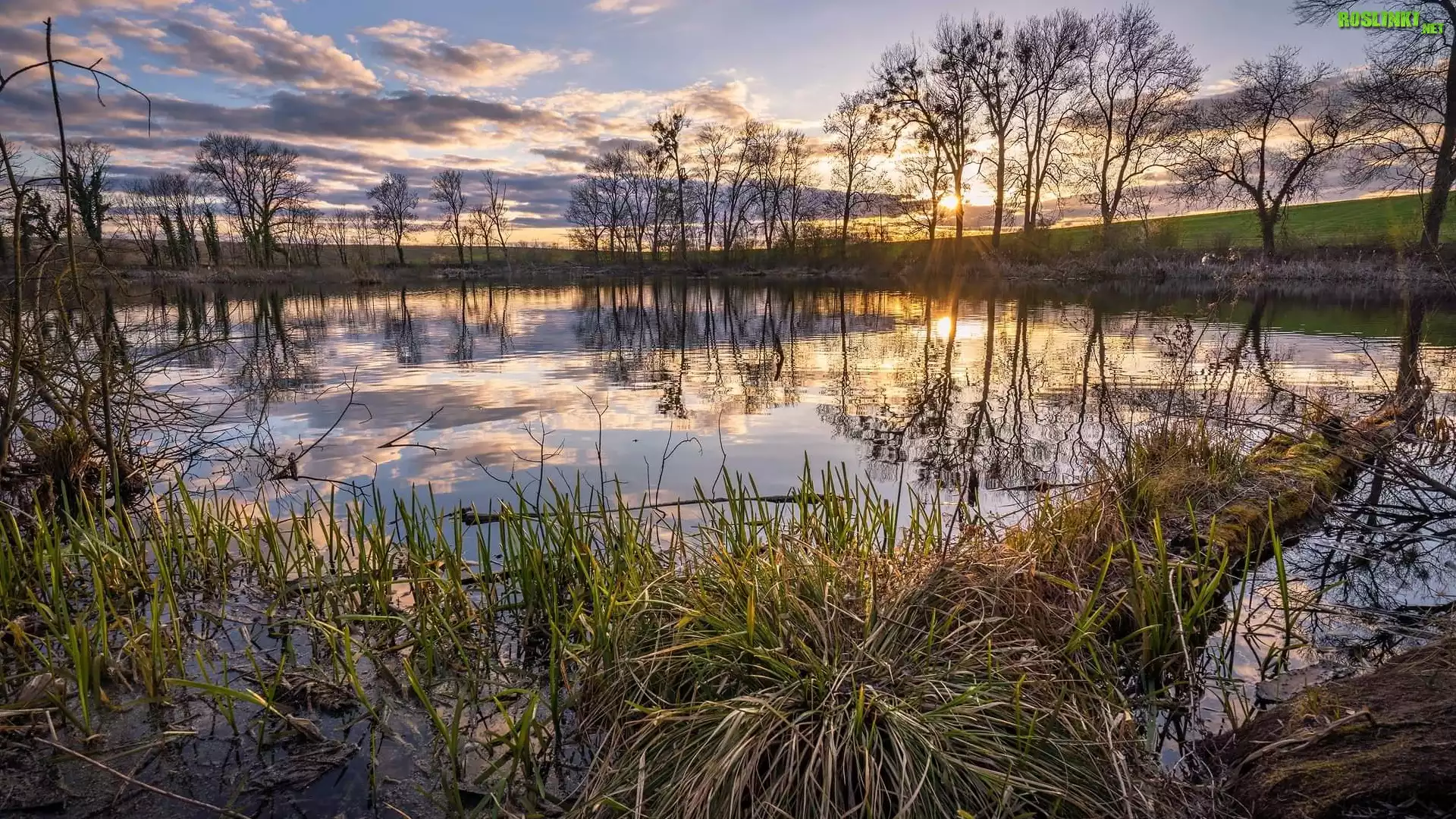Rośliny: Staw, Drzewa, Trawa, Wschód słońca